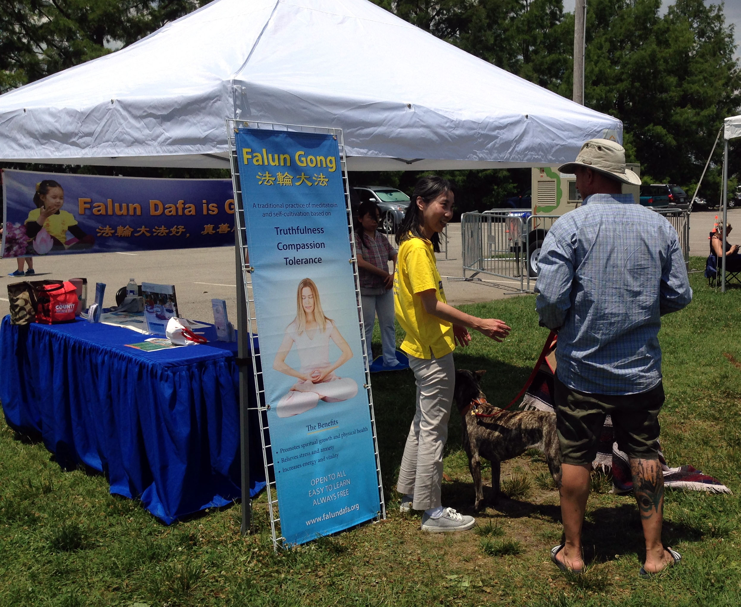 活动中一位白人青年比尔(Bill)主动来到摊位。交谈中他表示自己去年离开了原来的宗教,感到在那里无法找到更高更适合自己的真理。他还说一直在探索各种不同的追求人生真谛的途径,想要开阔自己的眼界。他一接触到法轮功学员就感到格外亲切。