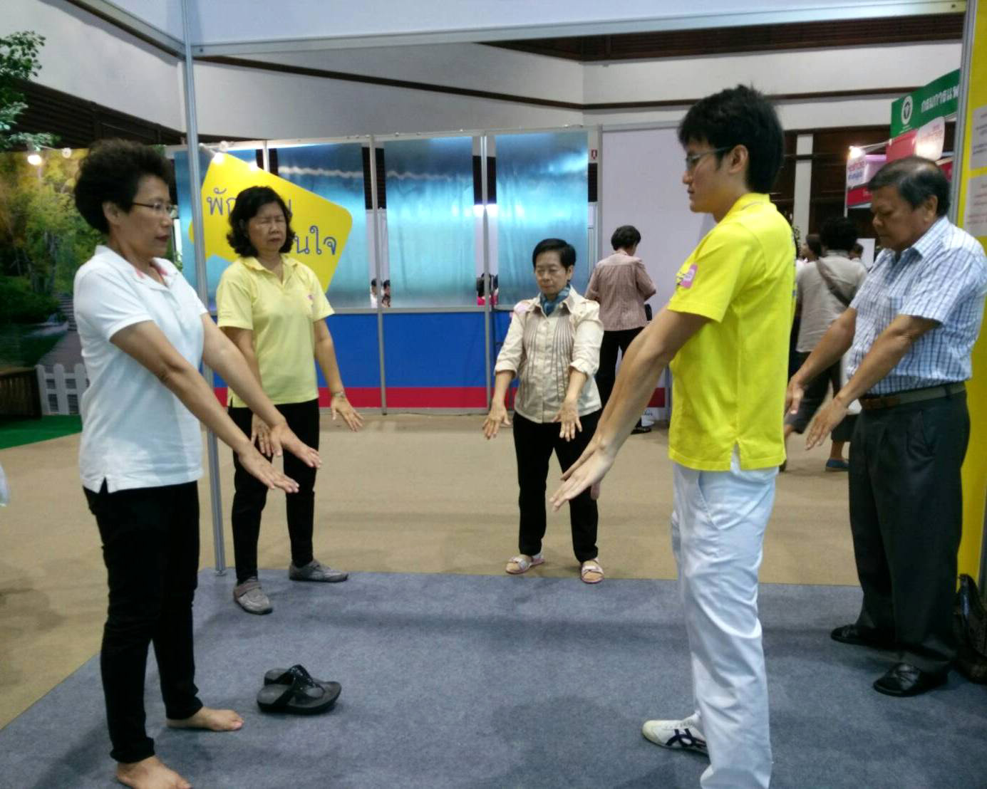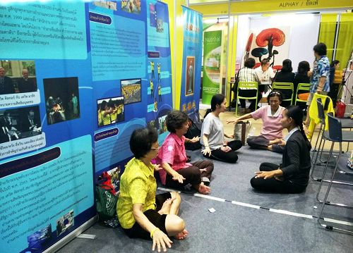 在泰国健康博览会会展期间,法轮功学员在大厅的展台上演示的优美功法尤其引人瞩目。学员向观众讲解了法轮功提升道德及祛病健身的神奇功效,人们表现出极大的兴趣,许多人当场学炼功法,有时展位上容不下,就移到大厅的其它空地。几天来,法轮功学员的展位深受欢迎,一批批泰国民众由此了解了法轮功的美好。