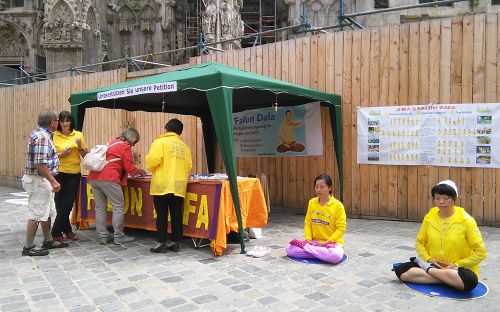 由于展台直接就在雷根斯堡地标式建筑——哥特式大教堂的前面,所以来往游客如织,有些甚至是从美国、台湾远道而来,也有不少从中国大陆来的旅游团。有一家三口从美国来的游客,看到学员在展示功法,很有兴趣地上前要了英文资料,得知事情的来龙去脉后,他们非常惊讶,都在征签表上签了名。他们表示,很高兴能在德国获知这么重要的信息,回去后会在网上了解更多相关的真相。