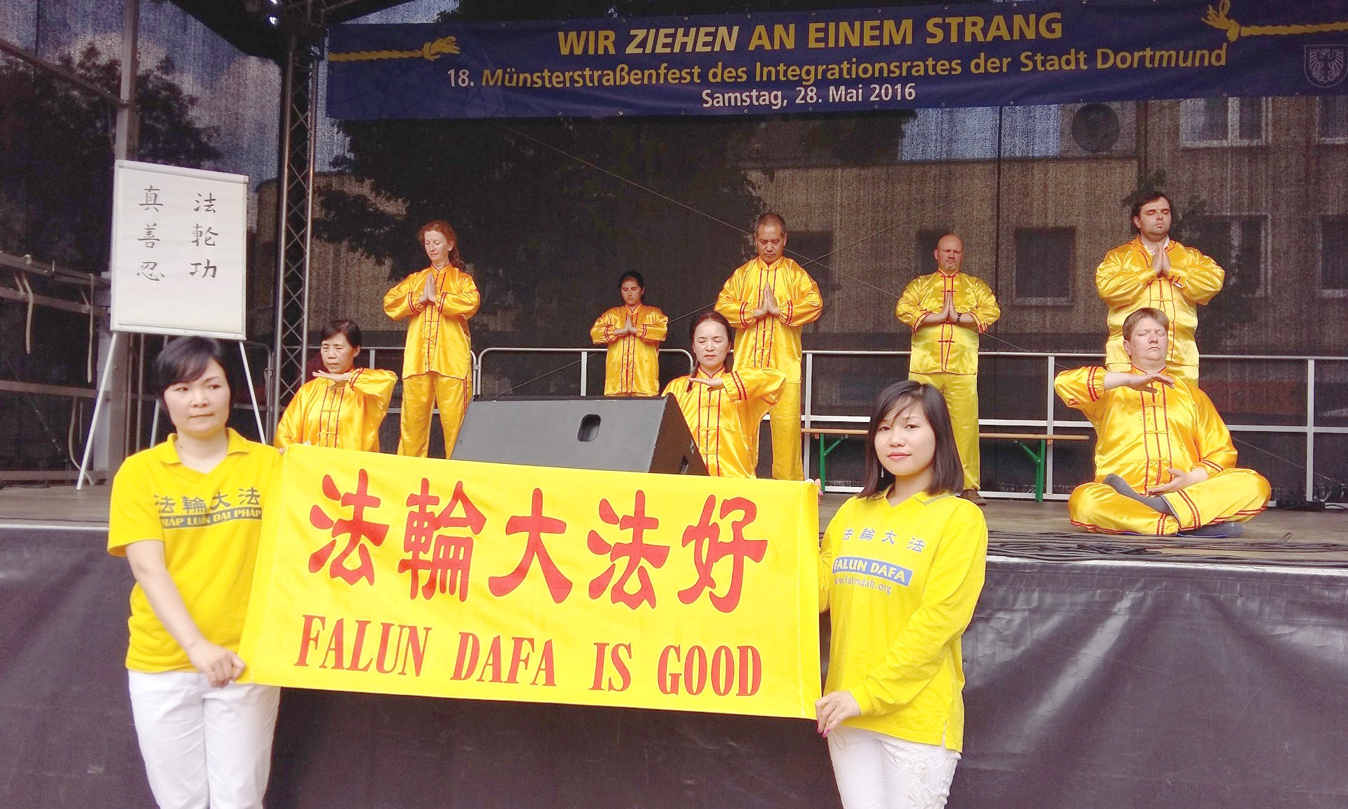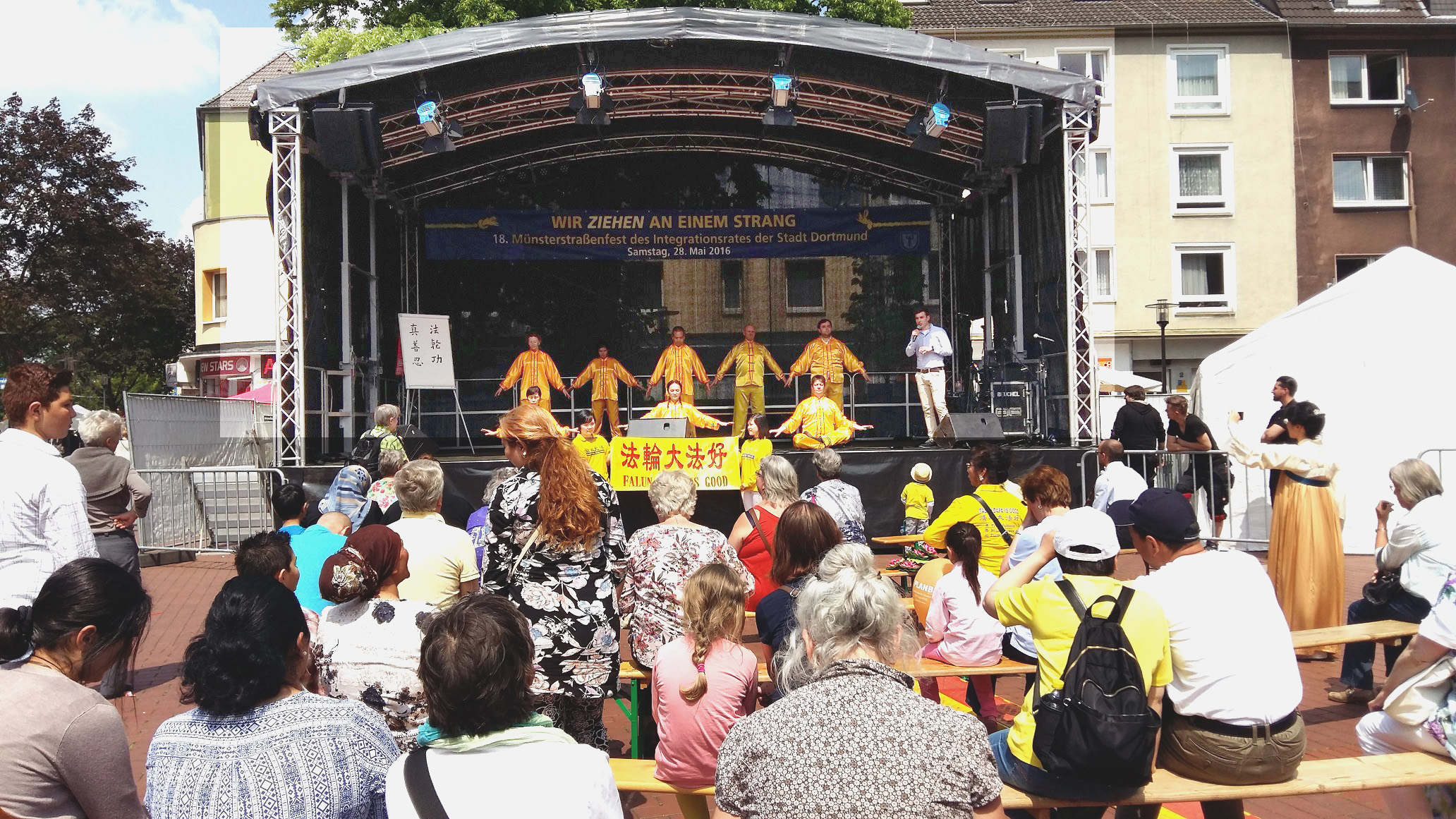 ![]() 图1-2:德国国际文化周开幕式 法轮功学员在舞台上进行功法展示 |