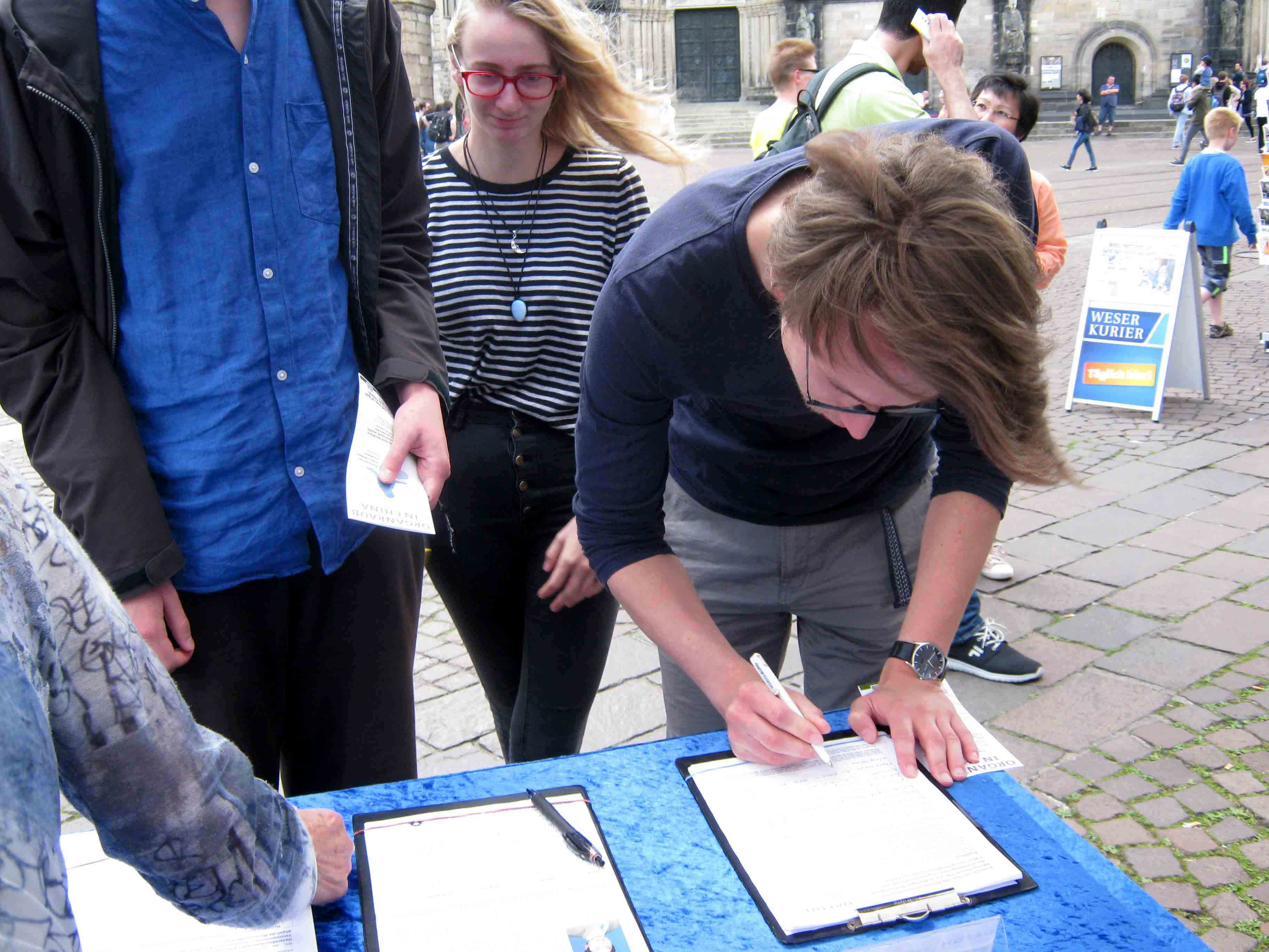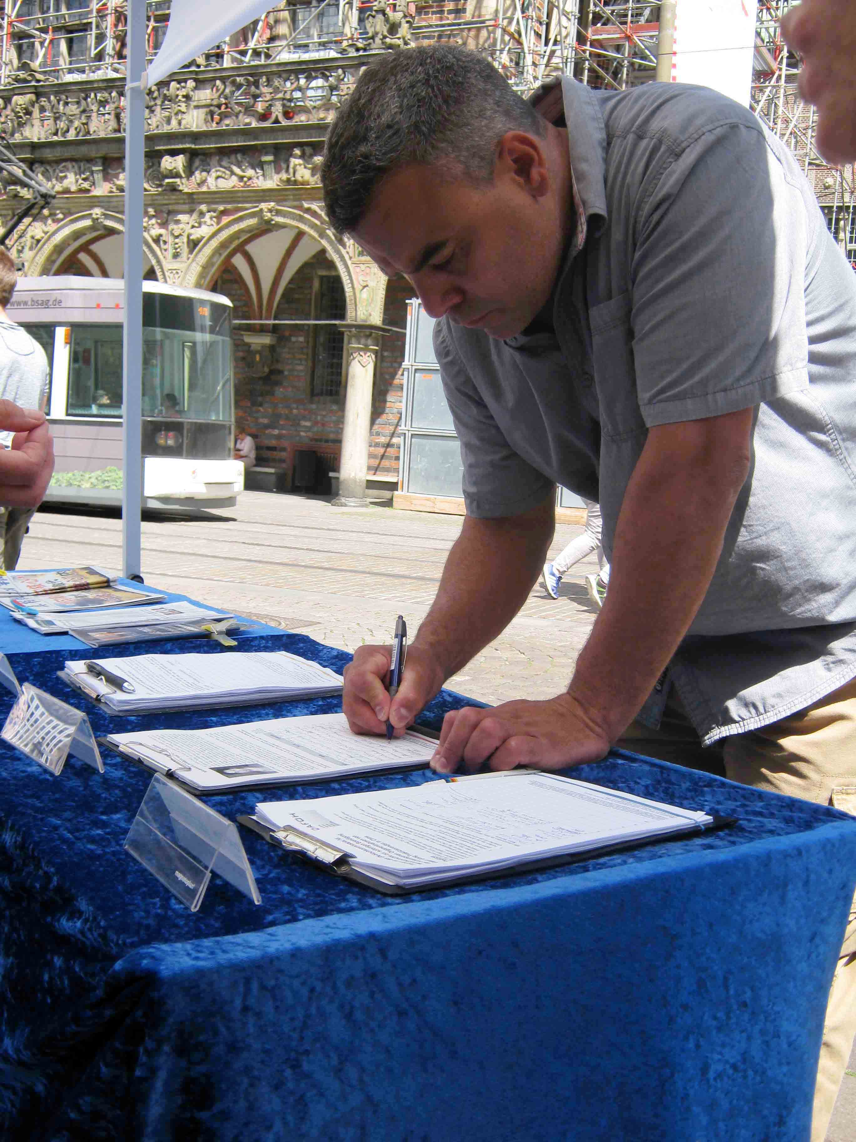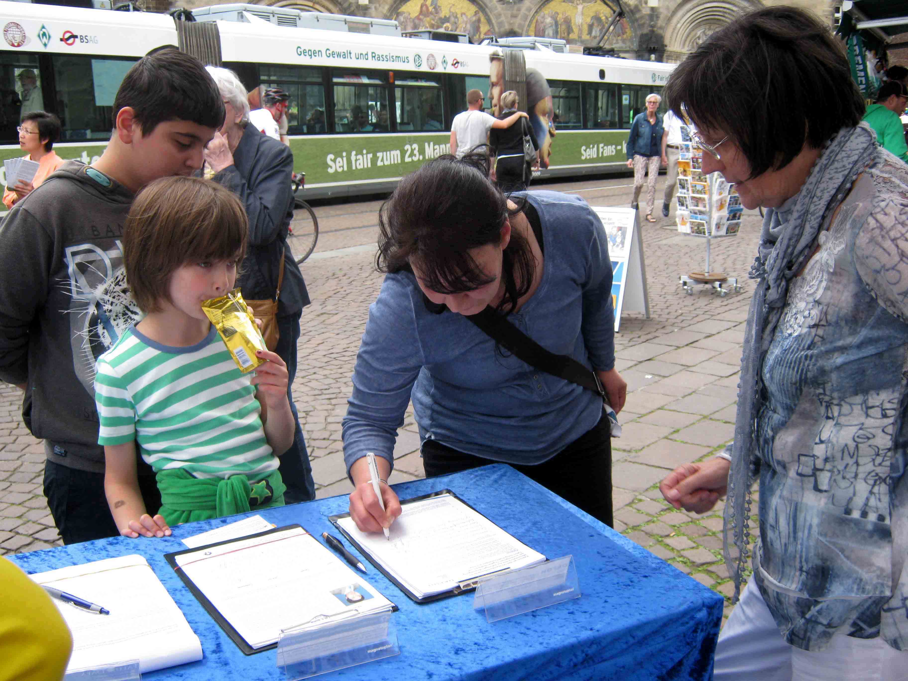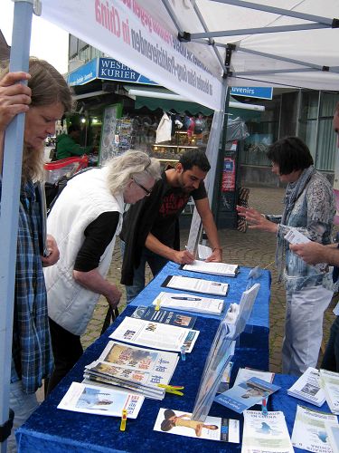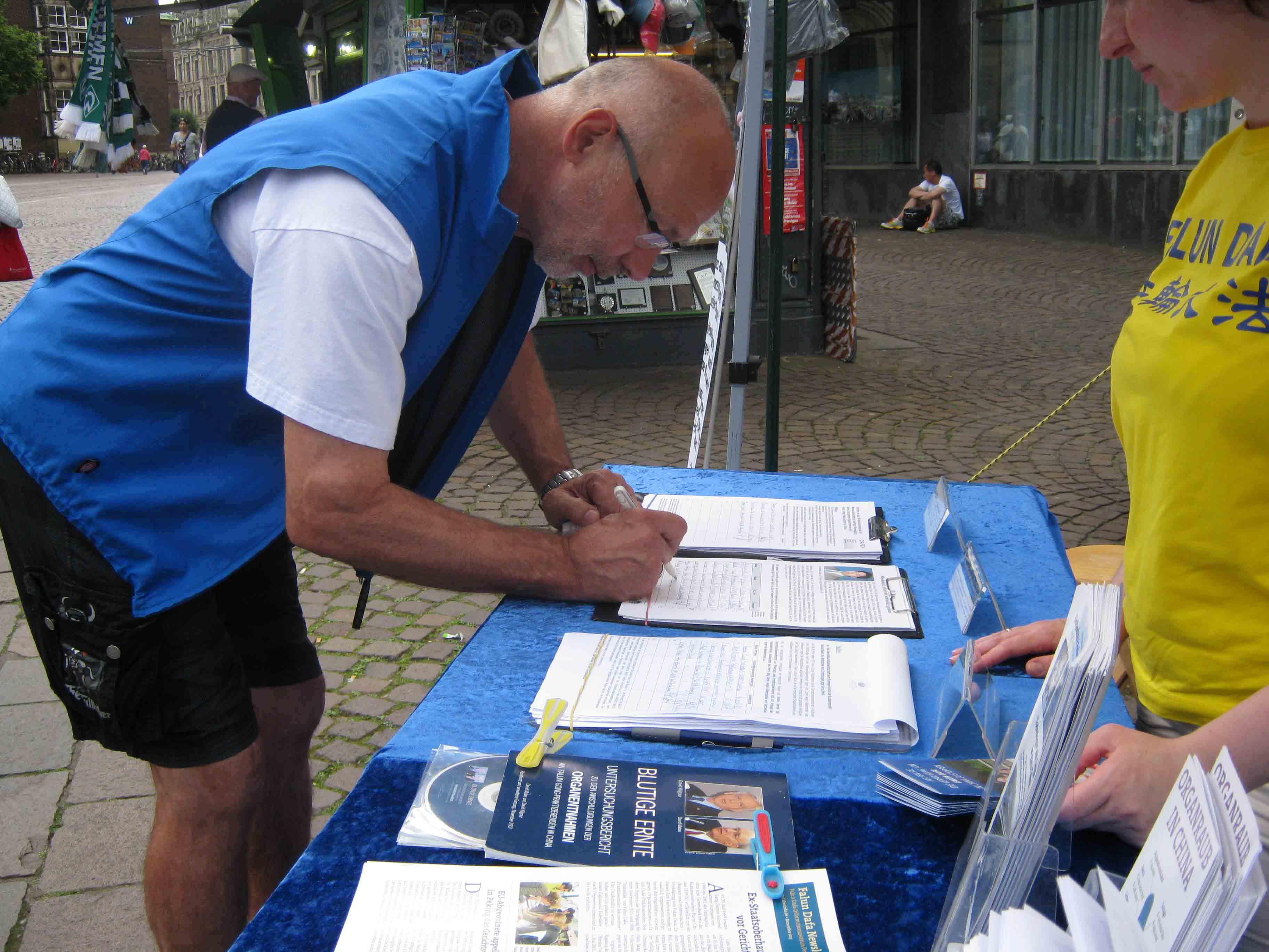 一对老夫妻来自不来梅也在的征签表上签字。老先生在中国工作了许多年,在那里听说过法轮功,法轮功学员和在他的谈话中感觉到他从中共那里得到很多错误信息后,和他谈了许多的真相。最后老先生拿走了一份中文真相资料,说要给他的中国朋友看。