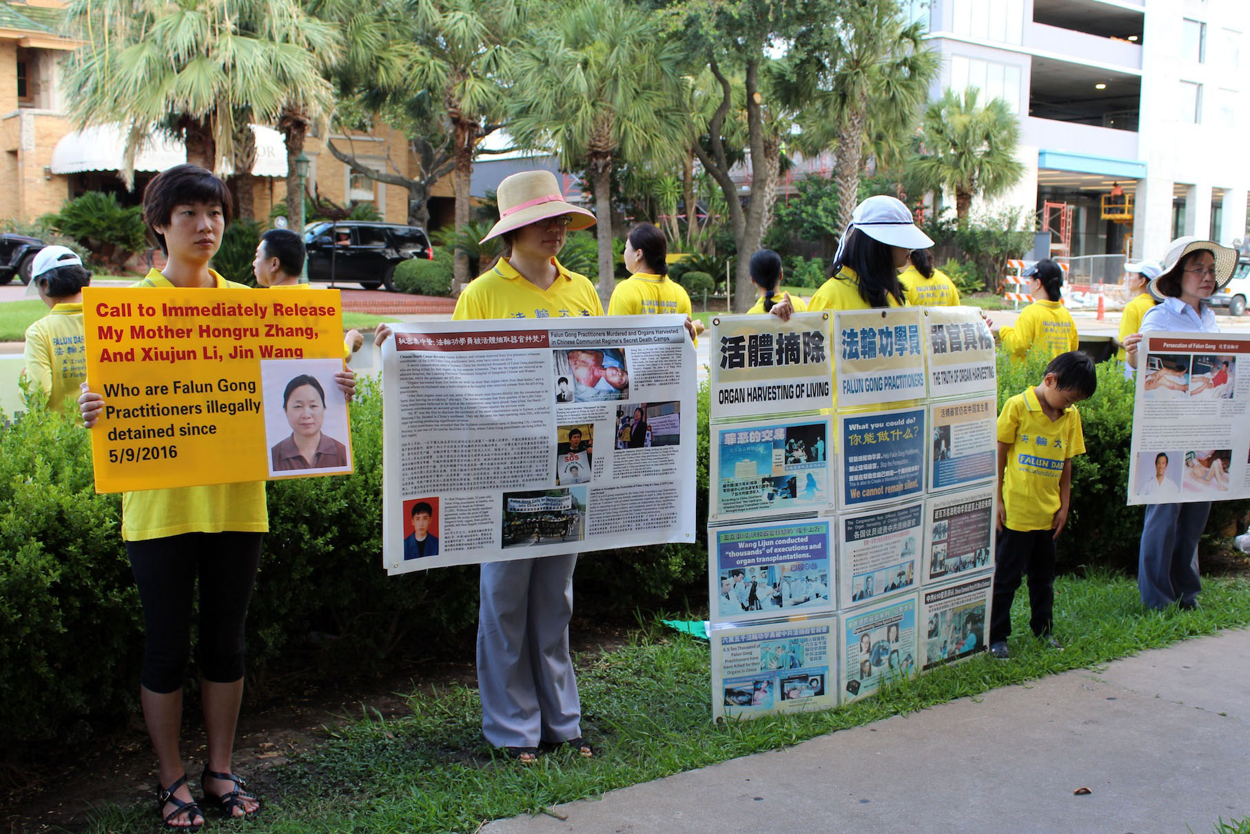 七月二十日休士顿天空晴朗,炎热高温,上午法轮功学员在中领馆前举行和平理性集会,学员在中领馆前手持中英文横幅:“法办江泽民”、“停止活摘器官”、“停止迫害法轮功”,以及活摘器官真人模拟展示中共活摘器官等。中领馆位于休士顿蒙确大道((Montrose Blvd) ,来往车辆很多,出入中领馆签证的华人及其他族裔人士,对法轮功的活动予以关注。