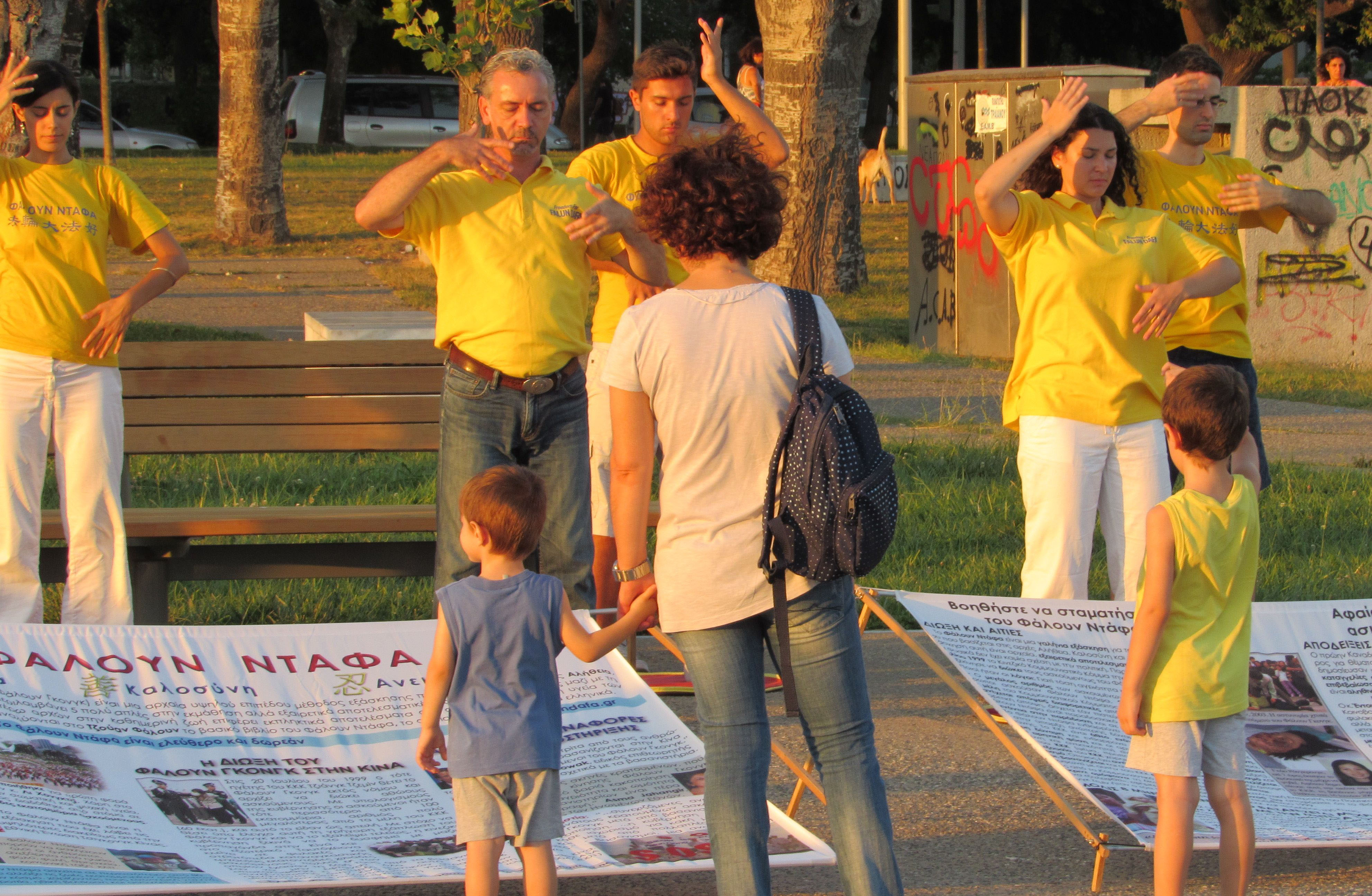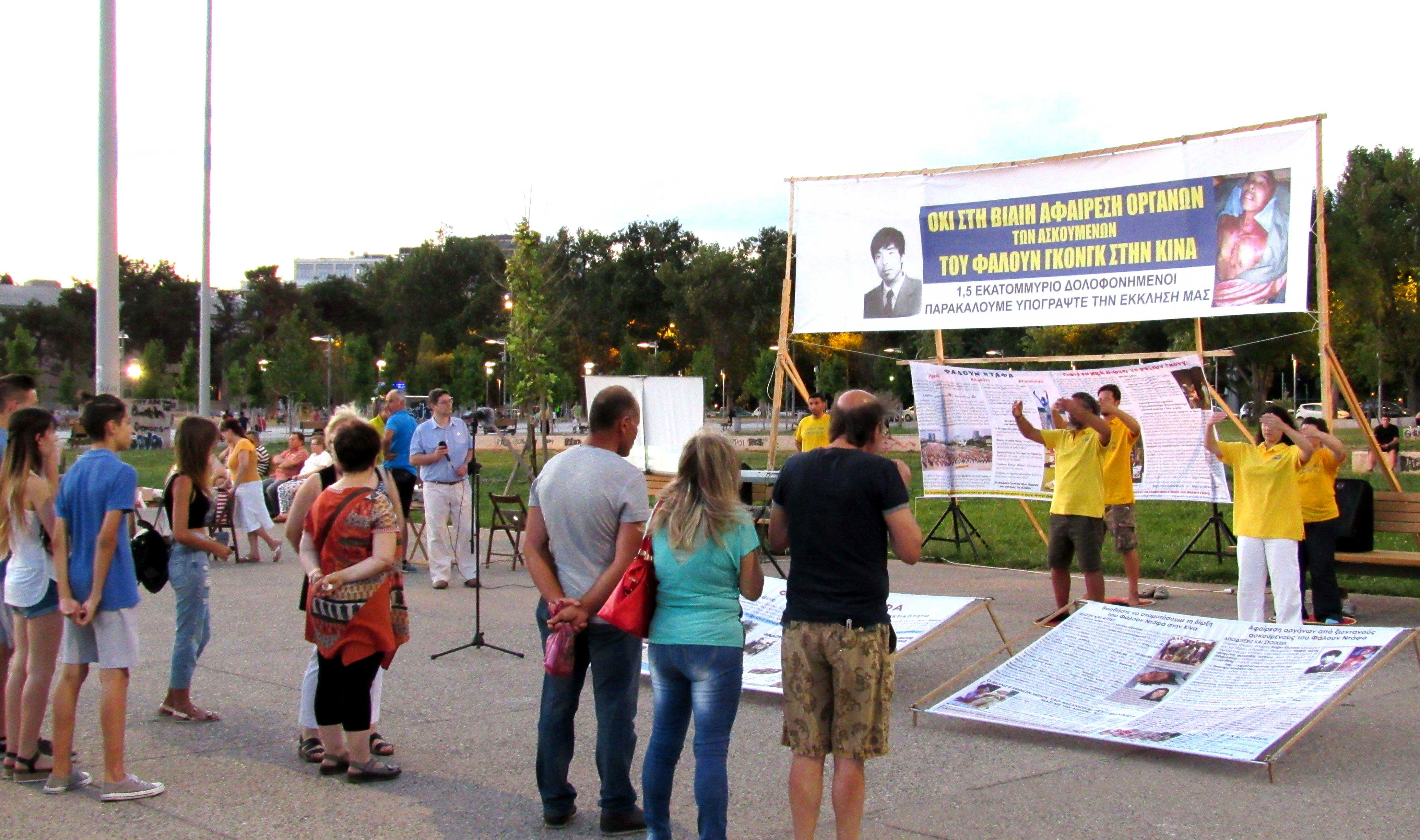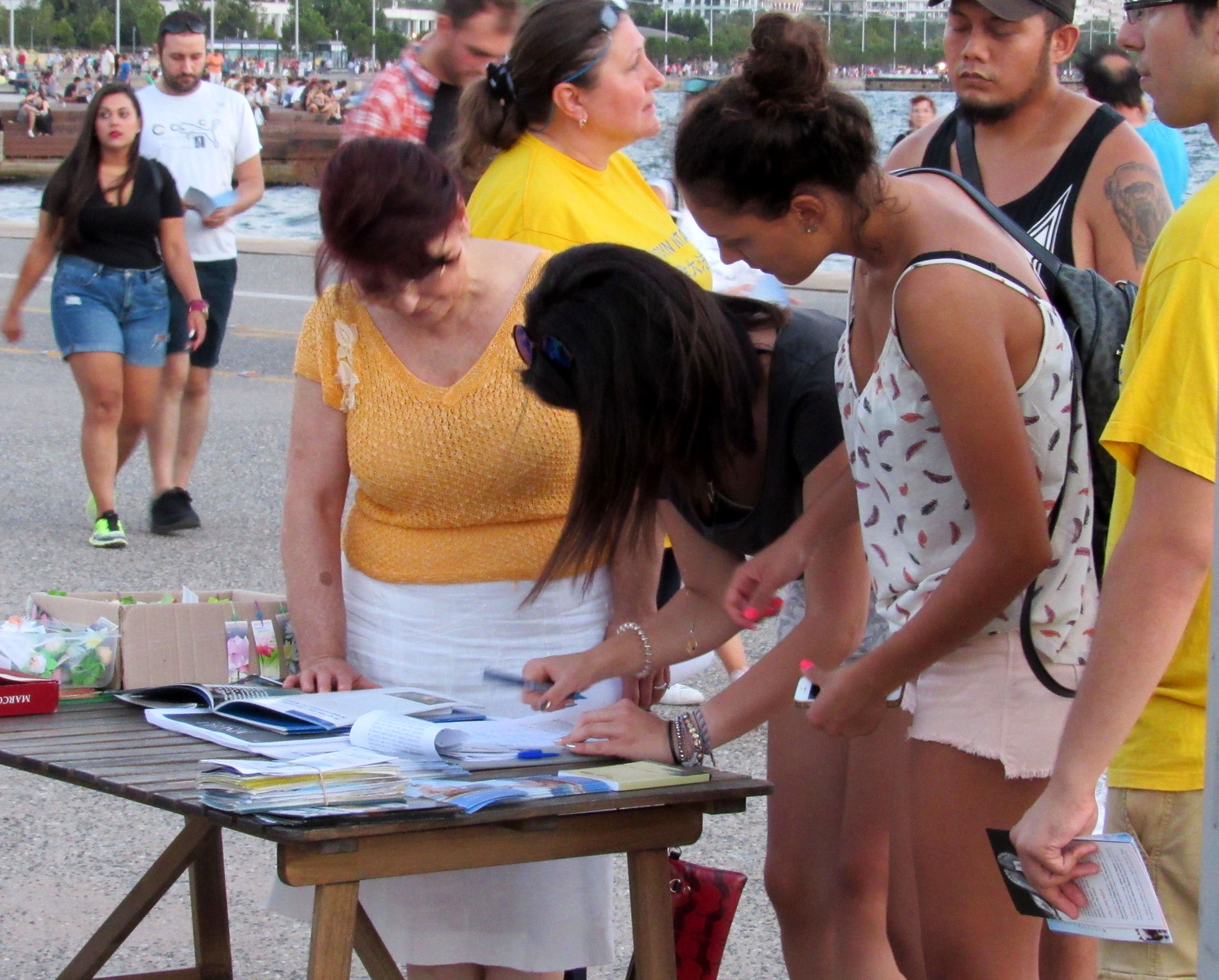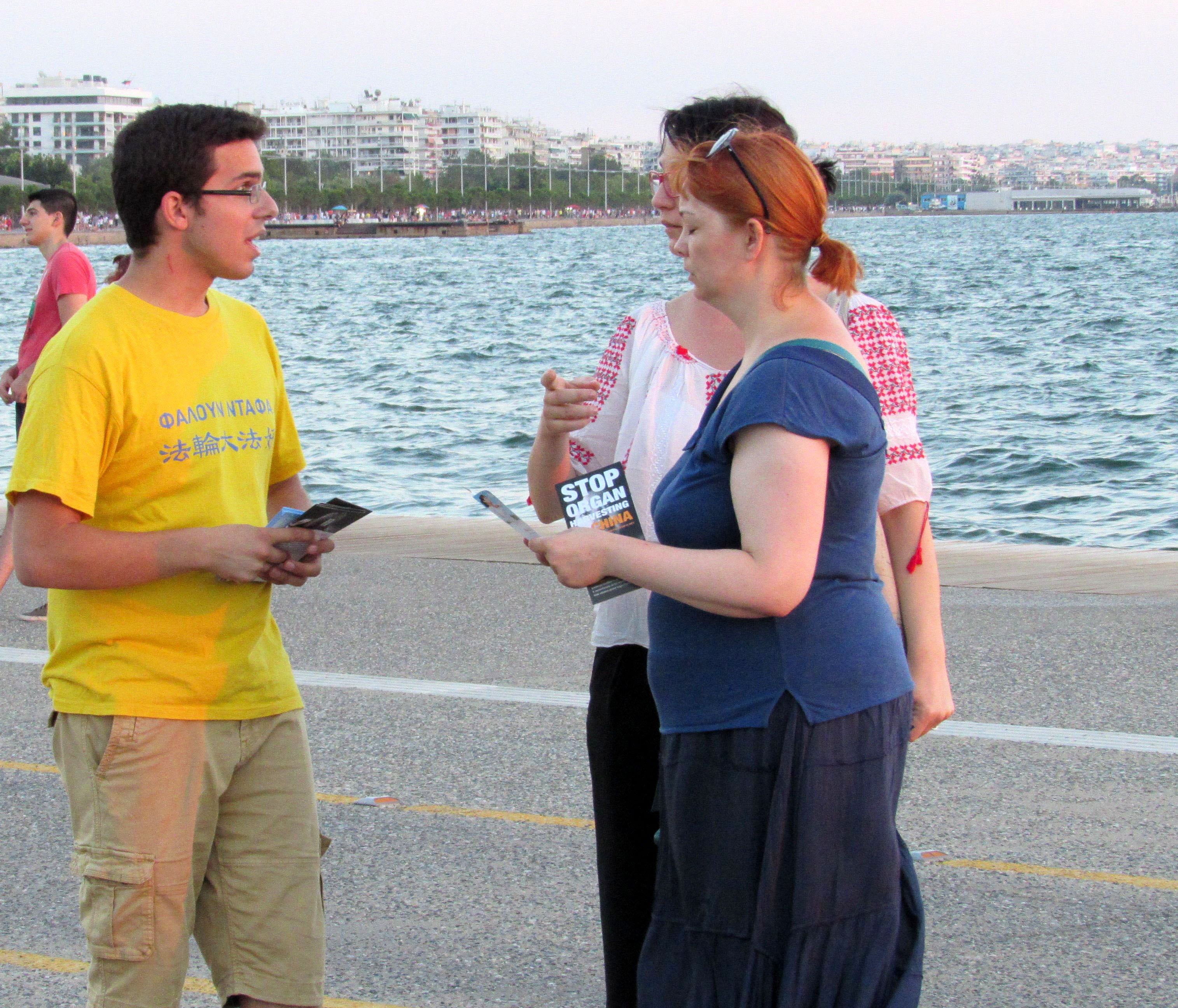 来自雅典等地的法轮功学员,在塞萨洛尼基市主要景点帕拉利亚(Paralia)打出横幅,告诉民众中共对法轮功的残酷迫害,以及活摘法轮功学员器官罪行,同时举行了支持起诉江泽民的征签活动。