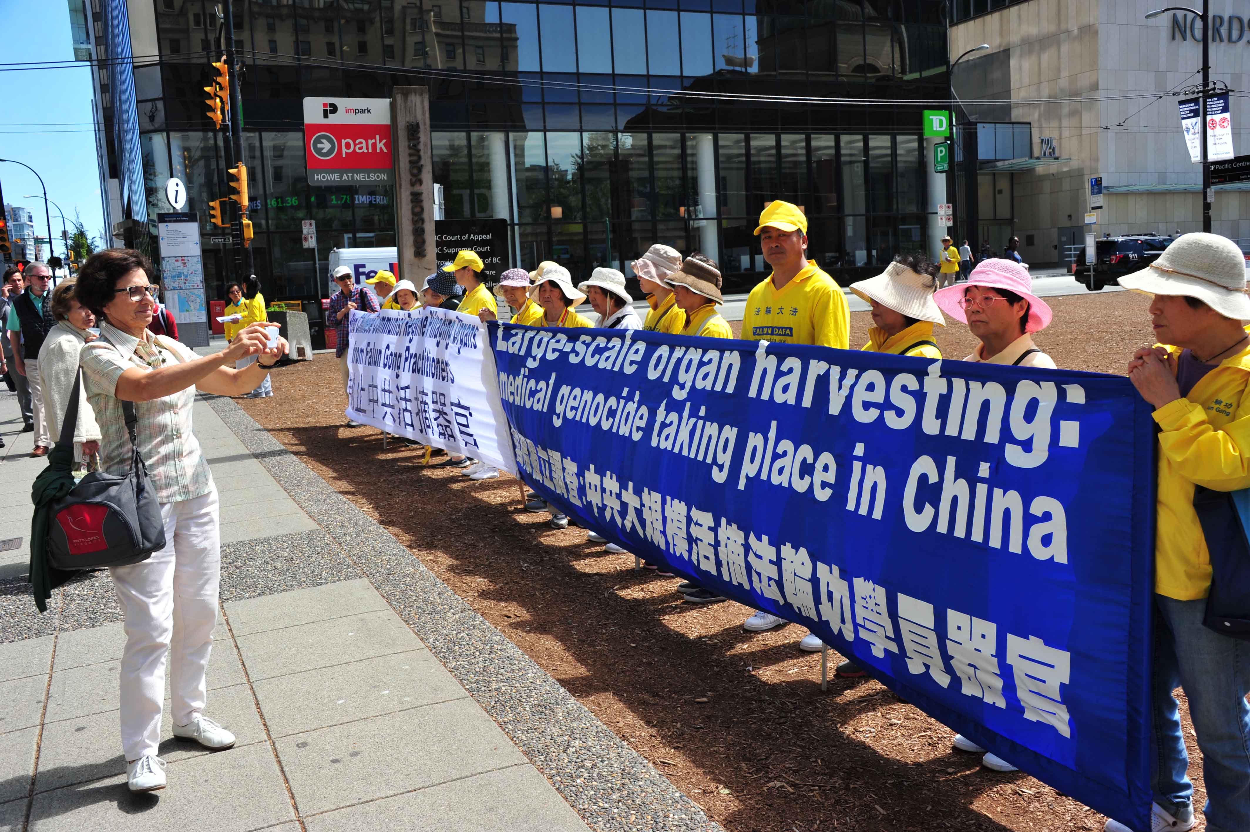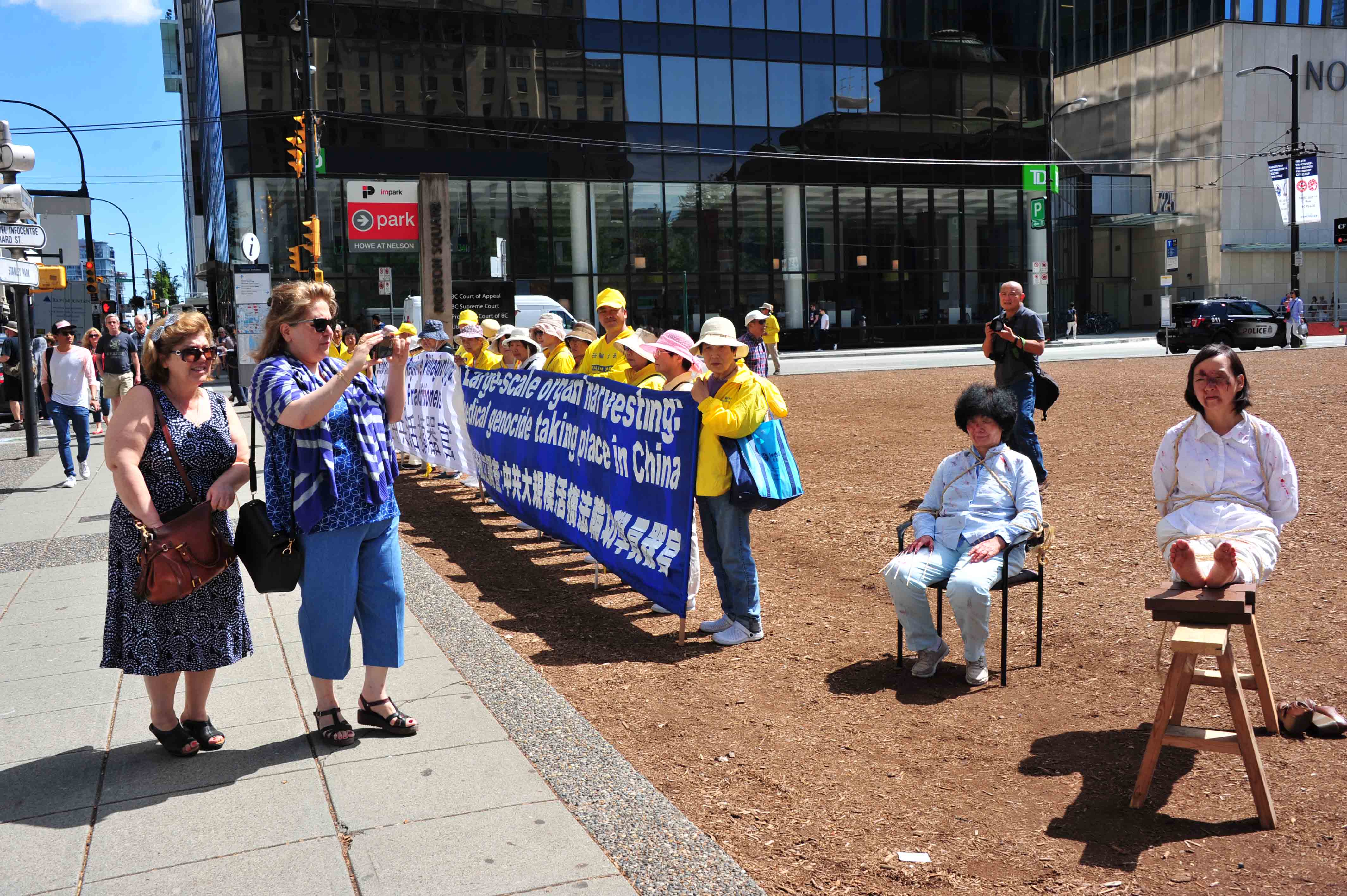 七月二十日温哥华法轮功学员在温哥华市中心乔治亚广场举行集会,反酷刑展等活动,揭露中共对法轮功的残酷迫害,呼吁世人一起支持法轮功反迫害,活动吸引很多过往的行人观看和拍照。