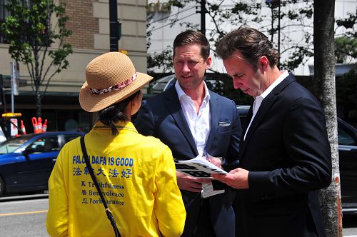 温哥华知名博客博主Dennis Watson先生今年看到主流媒体关于中共活摘法轮功学员器官的最新调查的报导后,义愤填膺。决定亲身参与和平反迫害,于七月十九日晚来到中领馆前,加入法轮功学员的烛光悼念。他并为七月二十日的集会写了发言稿,他在发言稿中写到:“在十七年残酷迫害下坚忍不屈地抗争,体现了你们的大忍精神,我的心和你们在一起抗争,你们的信仰是一种崇高的价值,值得去追求。我在八月份里,还会有时间参加你们在中领馆前的抗议活动,这件事对我来说是非常重要的事情,没有人可以因为信仰遭到迫害,关押。信仰自由是民主社会的基石。”