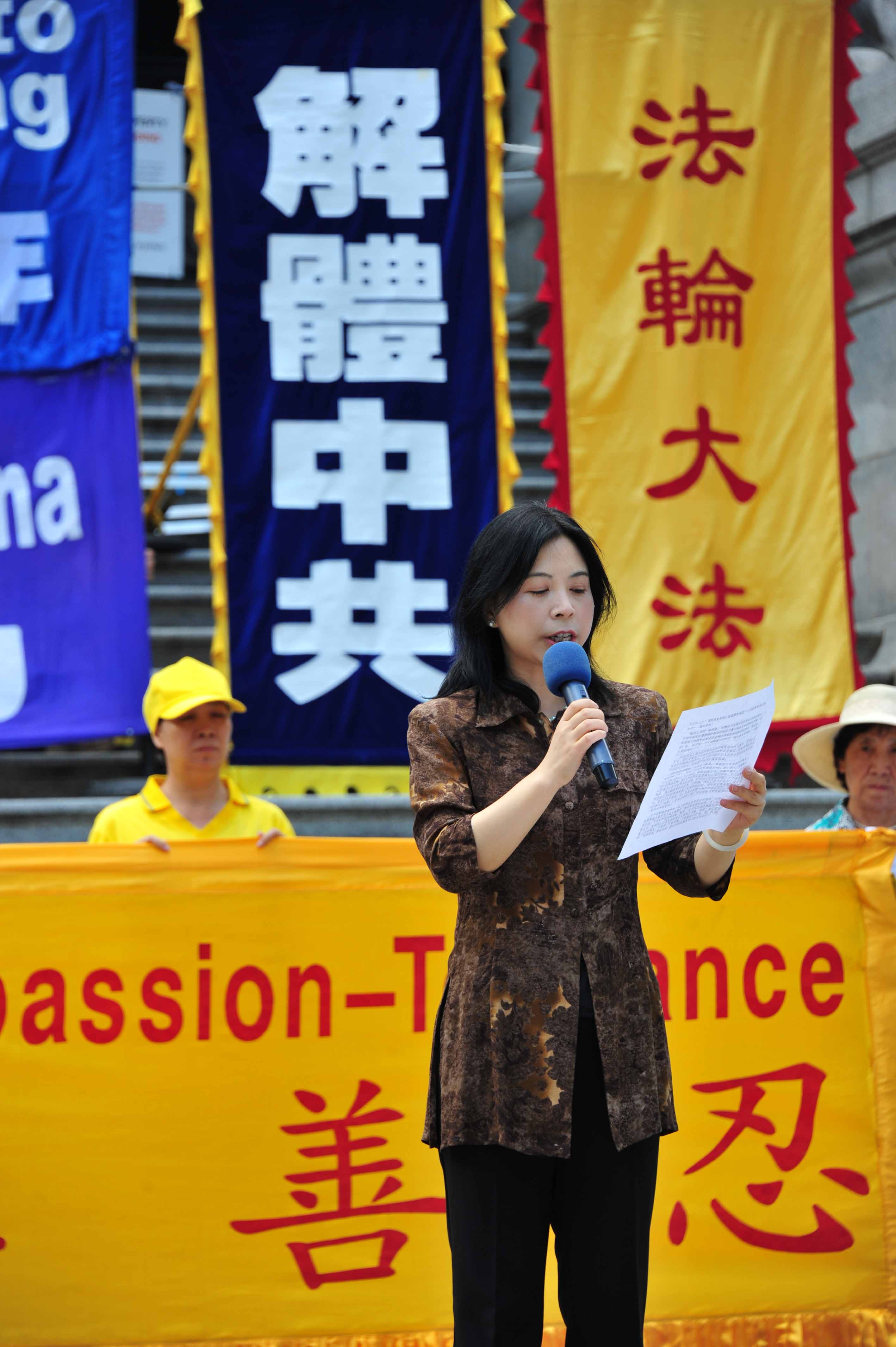 温哥华退党服务中心方女士在发言中说:今天七月二十日是中共发动对法轮功迫害的十七周年。“七.二零”标志着中共这个人类历史上最邪恶的黑势力全面迫害中华儿女的开始,也拉开了从未有过的庞大修炼人群为真理正义而救众于危难的序幕。中共在迫害中彻底腐败,在腐败中走向解体;法轮功在反迫害中不断壮大、在壮大中维护着良知和正义,延续着五千年的中华文明。此时,我们希望每一个中国人,不要等、不要犹豫,退出中共党、团、队,选择与邪恶决裂、与善良同行。