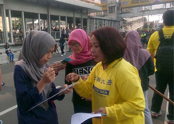 七月二十四日,印尼雅加达法轮功学员在中央商务区的主要道路旁集体炼功,并征集举报迫害法轮功的元凶江泽民的联署签名。