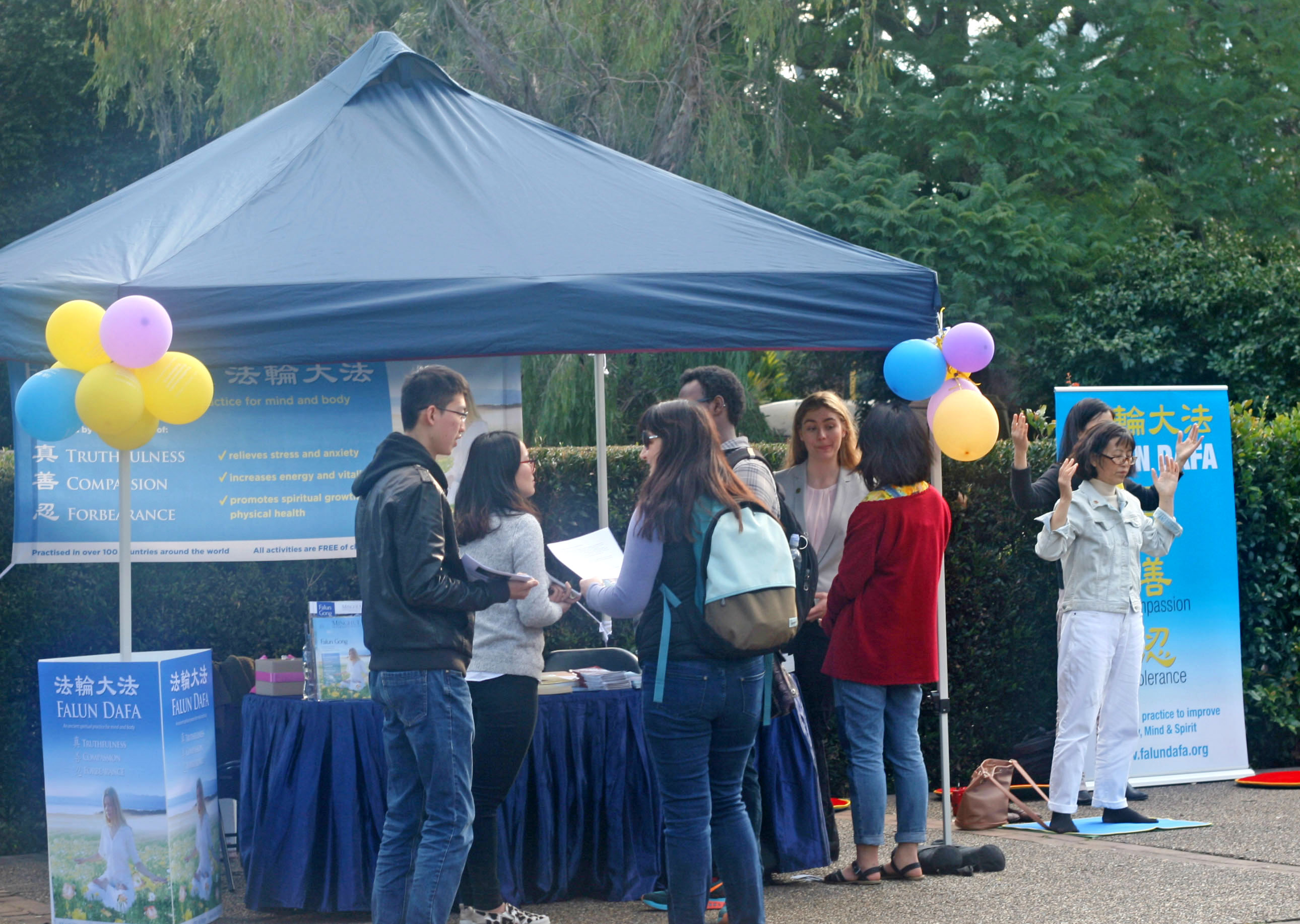 学员们在摊位现场展示功法,也吸引了很多对打坐感兴趣的西人学生前来了解,并注册加入社团。Emily表示她以前尝试过打坐,但因为时间的限制没有坚持。当她了解到法轮功可以循序渐进,打坐没有时间长短的限制,可以慢慢达到静下来的状态后,立即报名加入社团,并嘱咐学员一定不要忘记发邮件通知她。