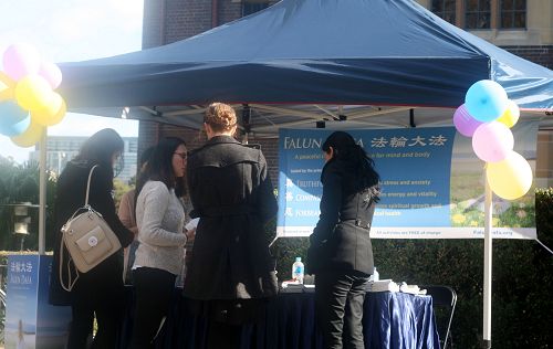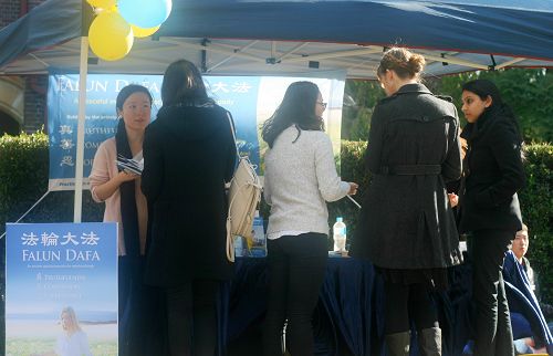 另一位来自中国大陆的女生经过时特意来到法轮大法社团的摊位前了解真相。她说她在美国的姐姐告诉过她法轮大法很好,但她还是有一些问题想问学员,包括中共为什么要发动这场对法轮功的迫害运动。学员将法轮功是什么,迫害是怎么开始的等真相讲给了她。她表示现在明白了,并拍摄了一些照片,并说会把这些照片送给她那些对法轮功感兴趣的西人朋友。