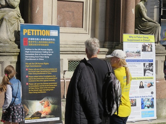 一位听过真相的英国老太太,时不时走过来,给学员买水喝。当学员问她是否要在征签表上签名时,她说:“哎呀,我走了这么多趟,都忘了签名了。”她表示很高兴看到有人为此(阻止活摘)而付出努力并且坚持,虽然这种罪行在发生,但是很多人视而不见。她希望自己的签名能够起到作用。