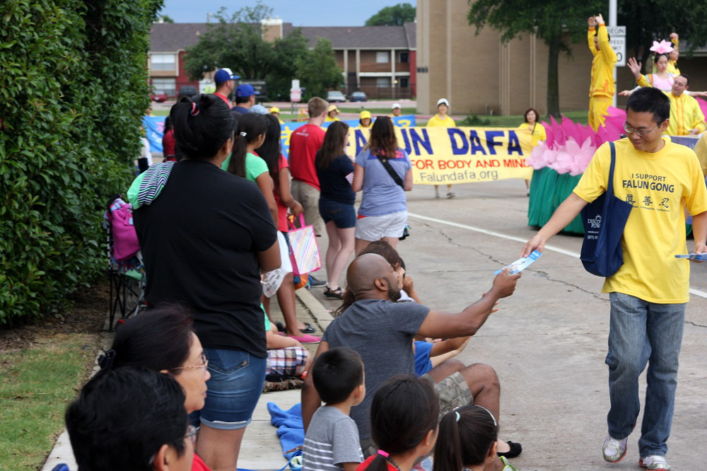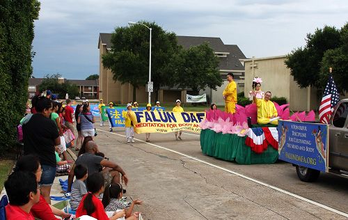 布兰诺市是位于达拉斯北部一个人口二十万多万的富裕城市,亚裔人口众多,国庆大游行由本市的狮子会主办。在过去几年中,法轮功学员都参加了这个游行并获奖。狮子会的乔治先生说:“活动没受天气影响,报名的团体都来了,其实这天气真的是太好了!”他很高兴法轮功学员再来参加。