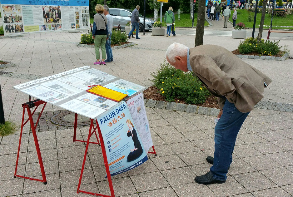 图1-4:二零一六年七月二日周六,德国法轮功学员在德国黑森林缇缇湖风景区举办法轮大法信息日,吸引中西方游人驻足了解法轮功。许多人认真阅读真相展板。