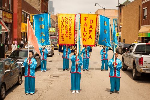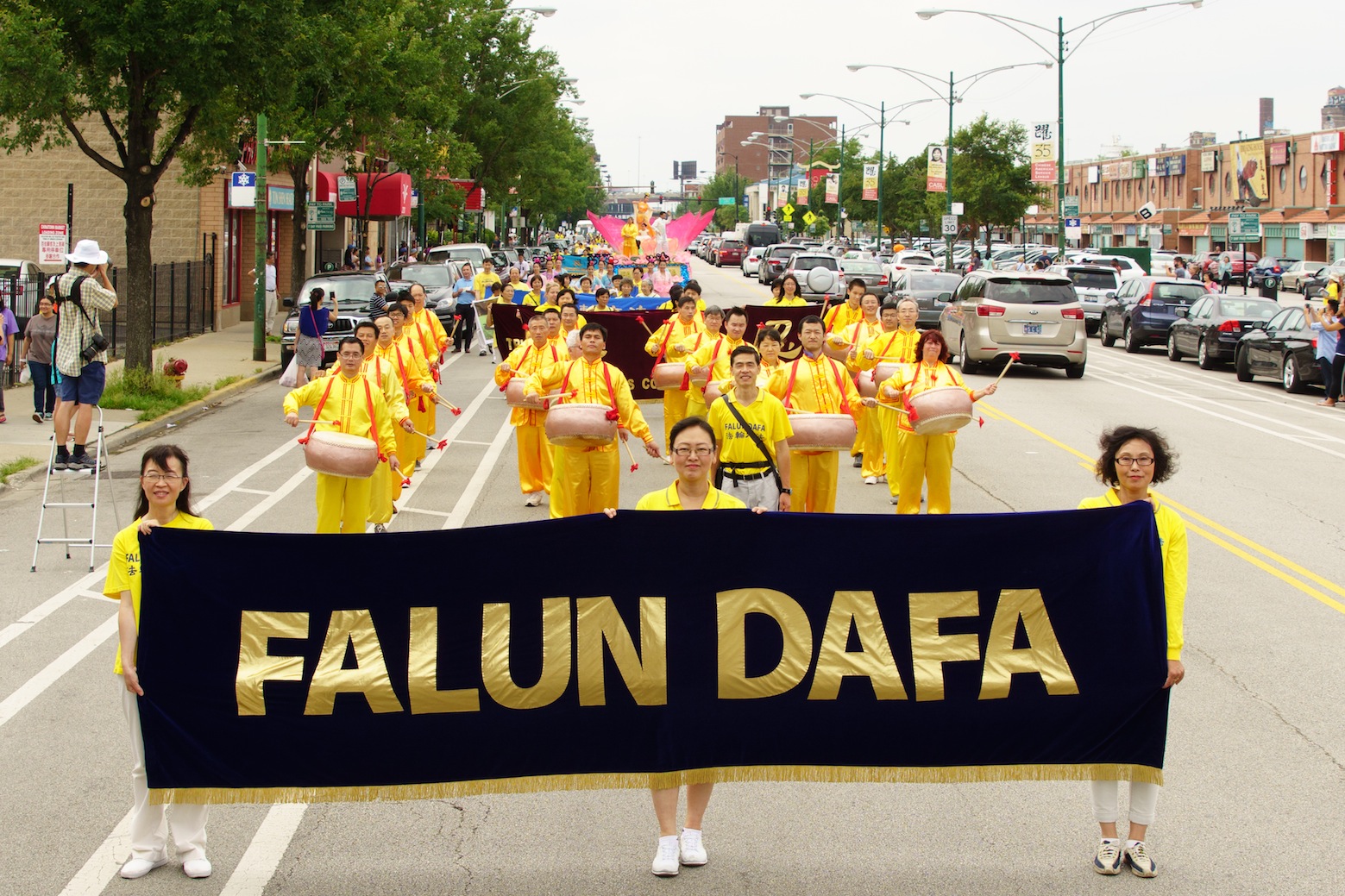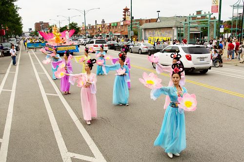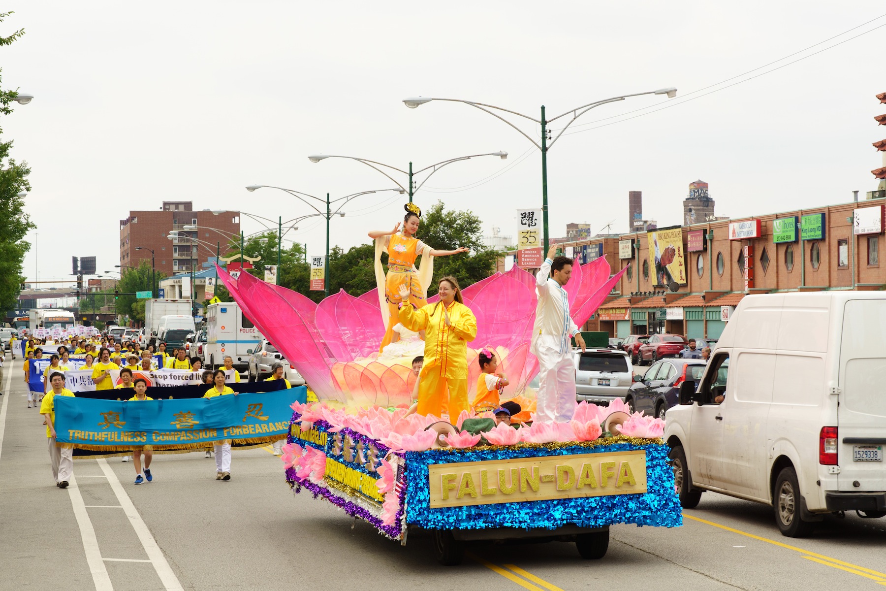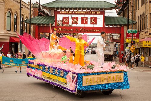 【明慧网二零一六年八月一日】二零一六年七月三十日,来自中部十个州的法轮功学员,齐聚芝加哥中国城举行盛大的游行。游行由“法轮大法”、“真善忍”的蓝色、金色中英文锦旗开道,身着黄色炼功服的堂鼓队精神抖擞的紧随其后,手持粉莲花的仙女们身着五彩古装翩翩起舞,随后是大型莲花花车,法轮功学员在上面展示优美的动作。这辆花车已经连续多年出现在当地的各大游行上,成了法轮功的标志性作品,为当地人所熟知。