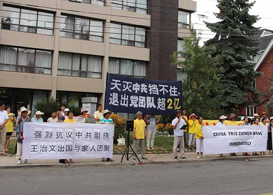 多伦多法轮功学员八月十二日在中共领事馆前举行新闻发布会,谴责中共当局阻挠法轮功学员王治文出境前往美国与亲人团聚。