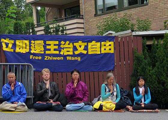 八月十三日,部份奥斯陆法轮功学员在中使馆前抗议江氏流氓集团阻挠法轮功学员王治文先生赴美与家人团聚。呼吁中国现政权还王治文先生自由!