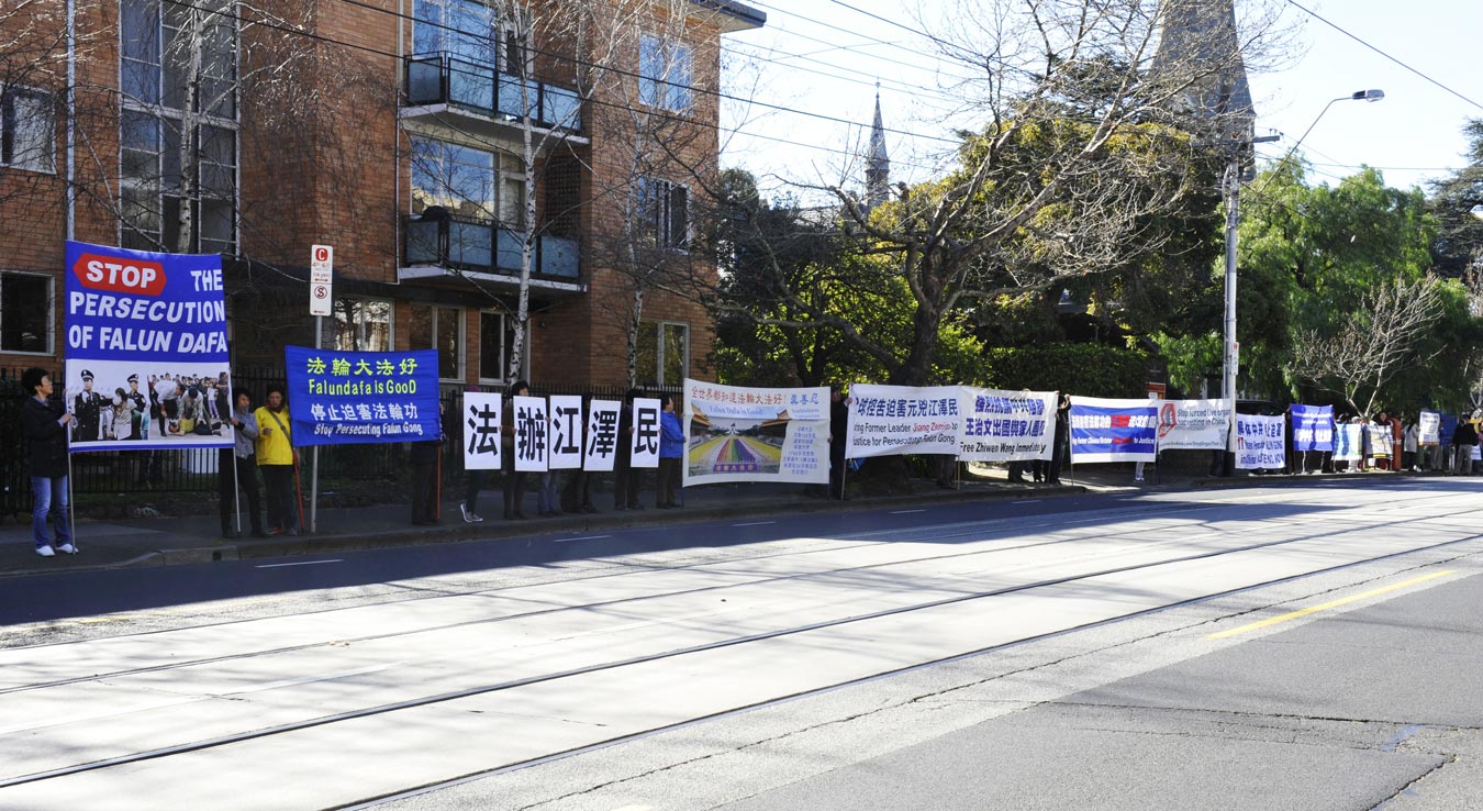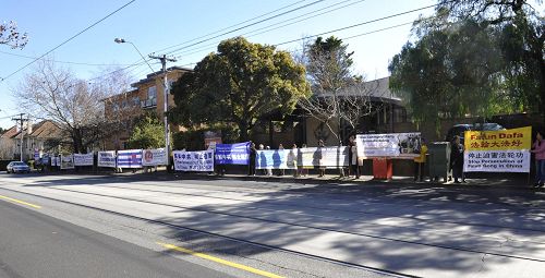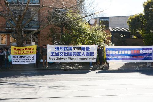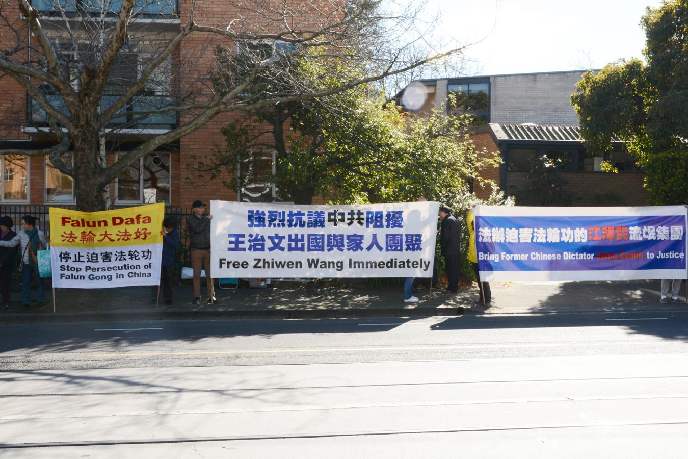 墨尔本法轮功学员在中领馆前打出“强烈抗议中共阻挠王治文出国与家人团聚”、“法轮大法好”、“停止迫害法轮功”、“法办江泽民”等真相横幅。