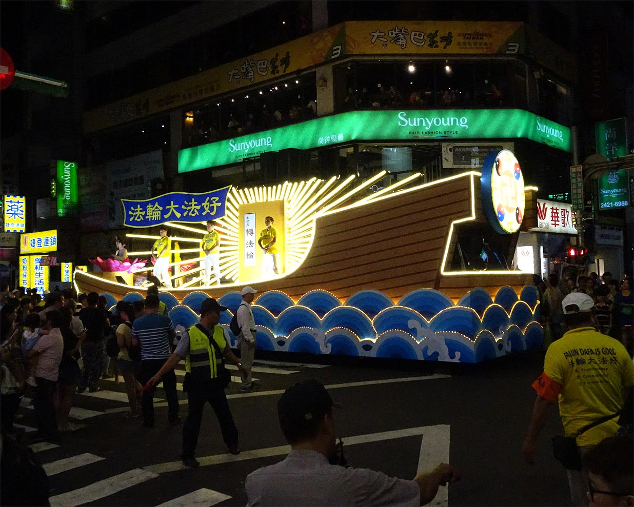 今年的游行有二十九个单位及上百个游行团队热情参与,台湾法轮大法学会也受邀参加此次游行。法轮功学员组成的天国乐团、花车、仙女队与腰鼓队所组成的队伍,所到之处人们纷纷照相、录影,尤其天国乐团及腰鼓队整齐的步伐、动听的演奏,一再得到民 众的鼓掌与欢呼; 法轮功学员装扮的仙女队沿途发放的精美莲花,更是人见人爱。法轮大法队伍经过司令台时,仙女们上台发放莲花,拿到的贵宾也都欣喜不已。