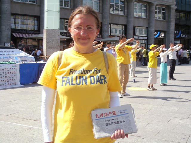一位身着黄色大法T恤衫,总是面带微笑,见到中国游客就用中文说“法轮大法好”并递上《九评》的西人学员,她叫拉丽萨·堪佩尔特,她是俄罗斯裔法轮功学员,在德国生活二十多年了,是汽车绘图技术员,于五年前幸得大法。