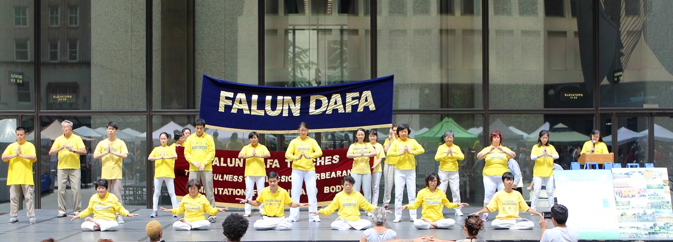 ![]() 法轮功学员在繁华的戴利广场(Daley Plaza)演示法轮功功法 |