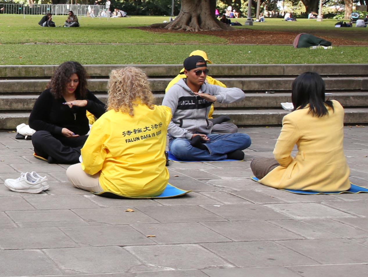 ![]() 图1-2:悉尼法轮功学员在市中心海德公园的主要入口处展开明信片征签活动 |