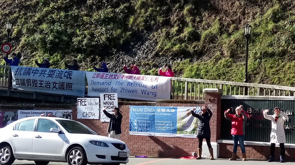 ![]() 新西兰首都惠灵顿学员来到中国大使馆前,抗议中共阻挠法轮功学员王治文赴美与女儿团聚 |