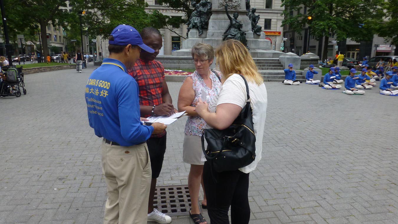 【明慧网二零一六年八月二十二日】二零一六年八月二十日下午,蒙特利尔法轮功学员在Philips Square广场举行了征集签名的活动,以促使加拿大总理贾斯汀·特鲁多于九月访华参加G20峰会期间,敦促中共现政权立即停止迫害法轮功以及立即停止活体摘除法轮功学员器官的罪恶行径。