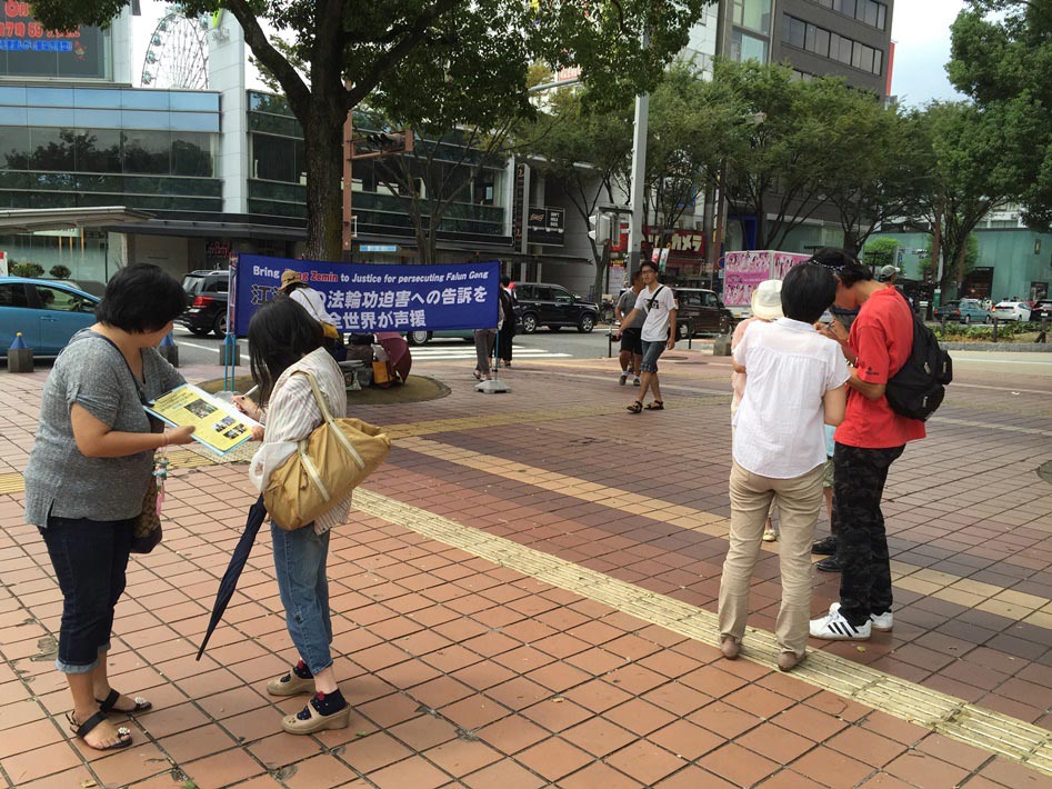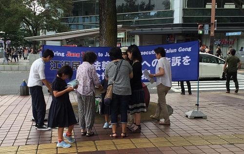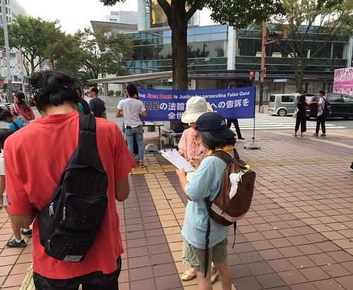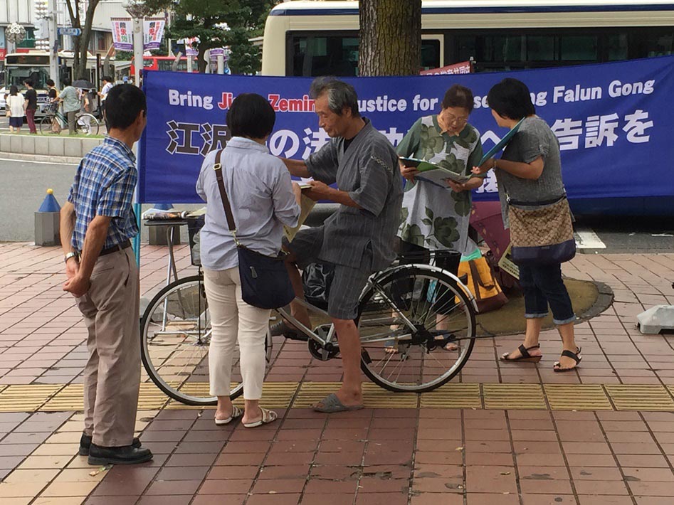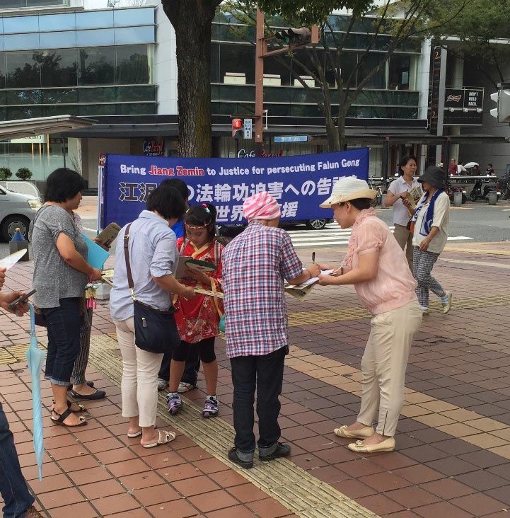 二零一六年八月二十七日和二十八日的祭典活动期间,法轮功学员也借此机会,在这盛大的节日上,在街边一角挂起了反迫害的条幅,并向过往民众讲述江泽民迫害法轮功的真相。听了真相的民众都被江泽民及中共的恶行所震惊,并积极的在“刑事举报书 举报江泽民迫害法轮功之罪行”上签名,声援法轮功学员和平理性反迫害。截至二零一六年七月,已经有十七万多的日本民众署名举报江泽民迫害法轮功。