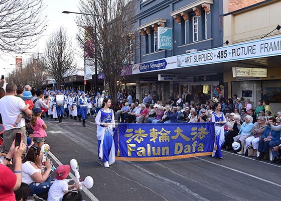 由56名法轮功学员组成的天国乐团是今年澳洲图文巴市嘉年华游行活动的开路先锋。一曲《法轮大法好》划破长空,开启了花节大游行。