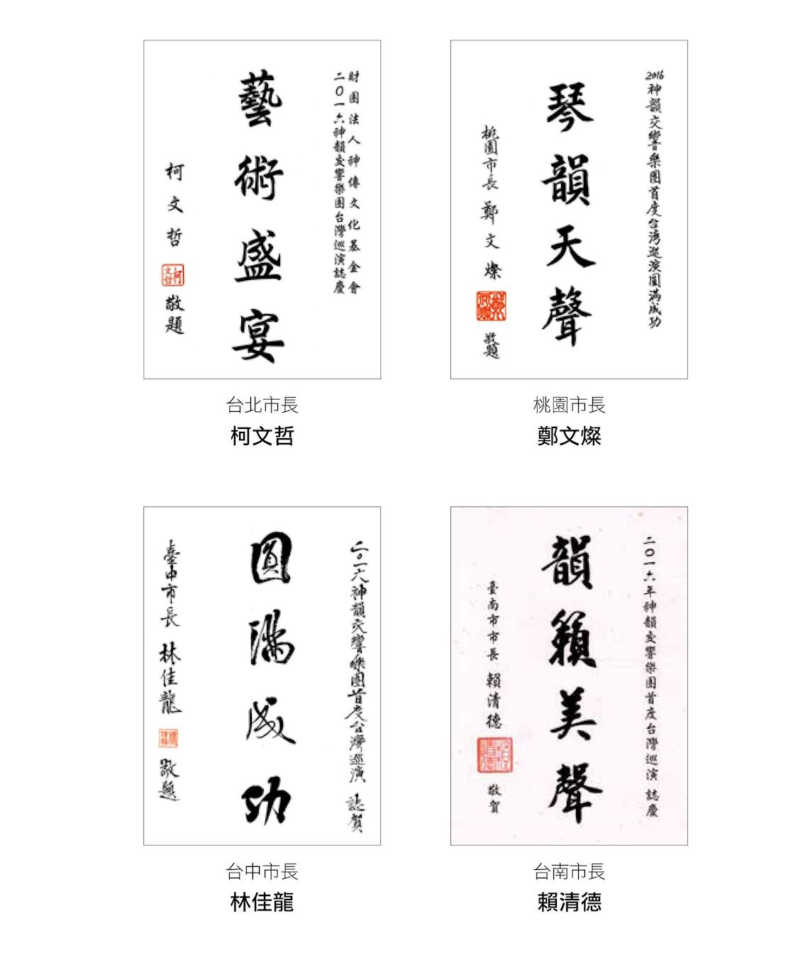 ![]() 图4:台北市长柯文哲、桃园市长郑文灿、台中市长林佳龙、台南市长赖清德发贺词祝贺神韵交响乐团演出 |