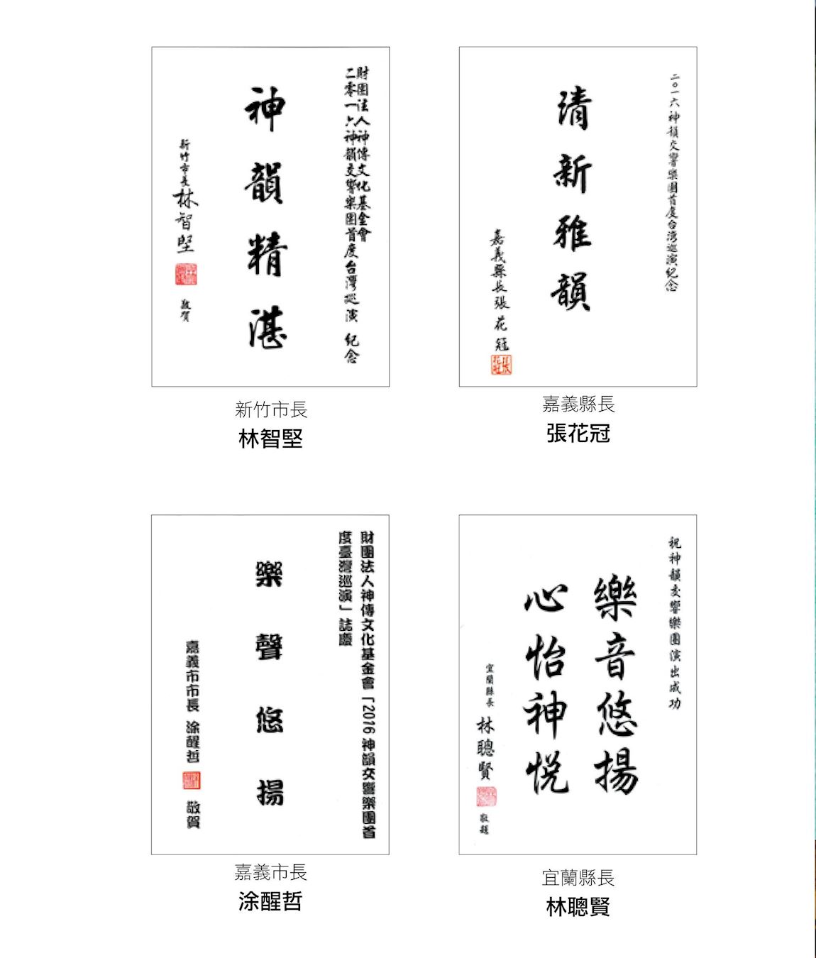 台北市长柯文哲发出“艺术盛宴”贺词,桃园市长郑文灿与台南市长赖清德分别以“琴韵天声”、“韵籁美声”推崇神韵交响乐团,台中市长林佳龙祝贺演出“圆满成功”。