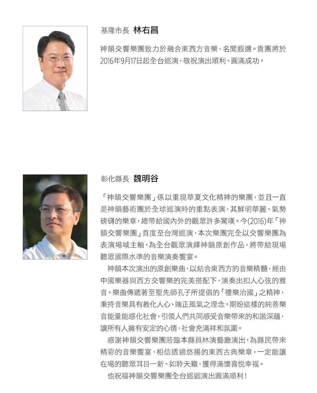 ![]() 图6:基隆市长林右昌、彰化县长魏明谷发贺文祝贺神韵交响乐团演出 |