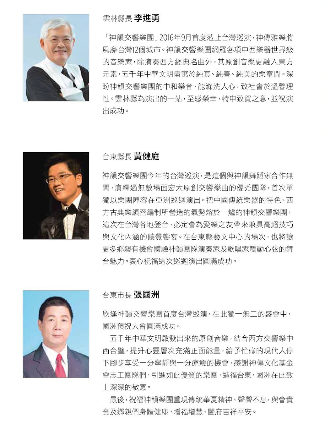 ![]() 图7:云林县长李进勇、台东县长黄健庭与台东市长张国洲发贺文祝贺神韵交响乐团演出 |