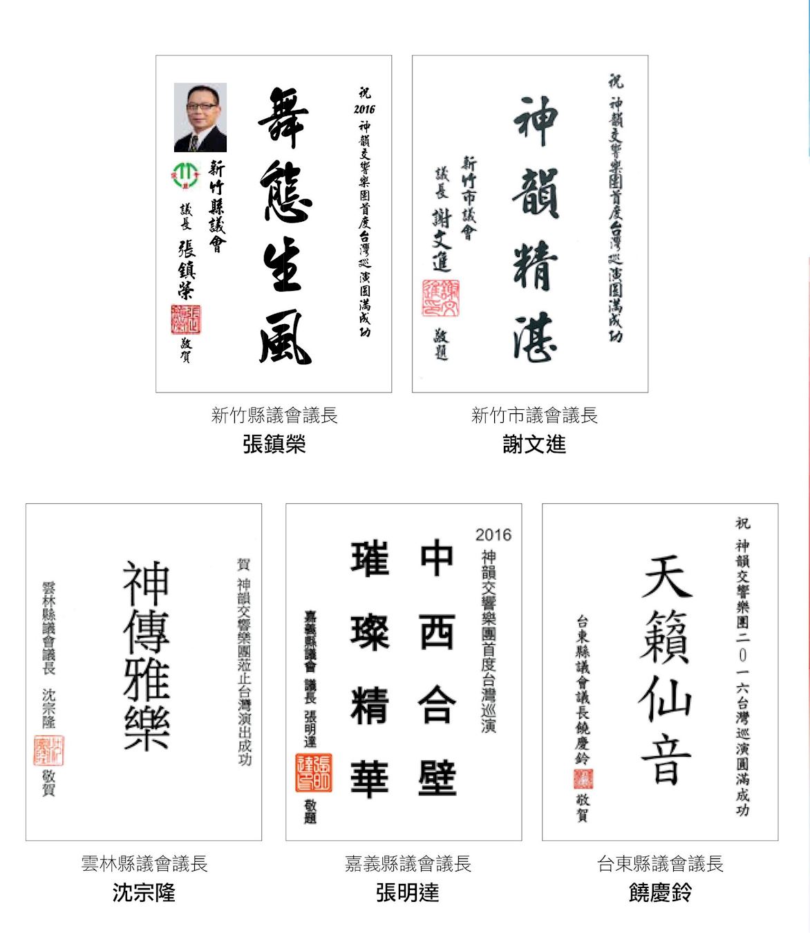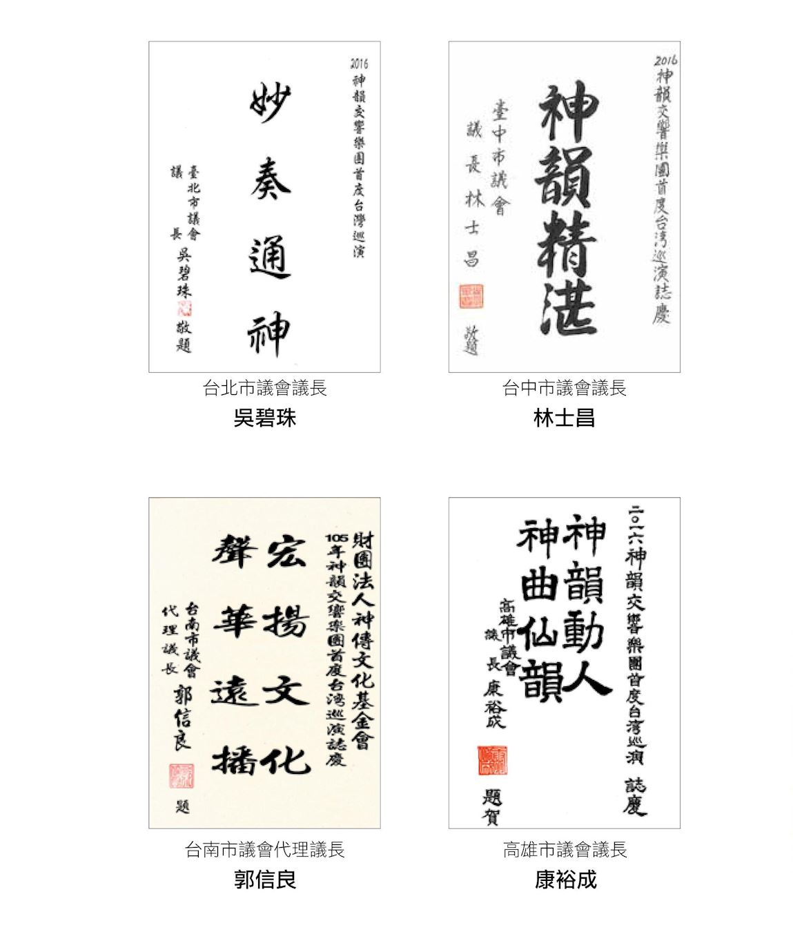 此外,台北市议会议长吴碧珠、台中市议会议长林士昌、台南市议会代理议长郭信良与高雄市议会议长康裕成,分别发出“妙奏通神”、“神韵精湛”、“宏扬文化、声华远播”与“神韵动人、神曲仙韵”赞扬神韵交响乐团。
