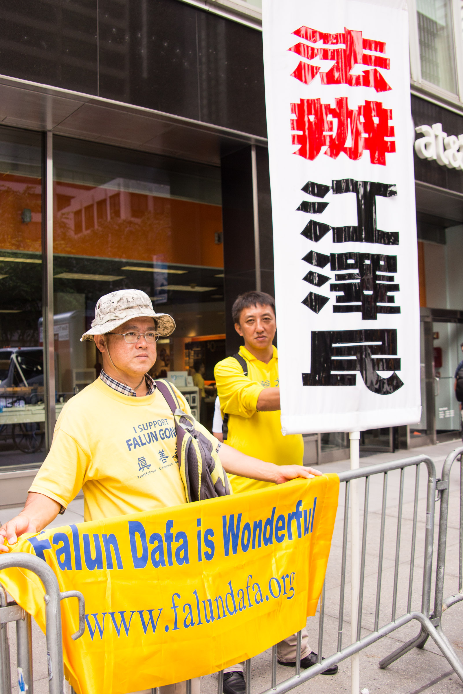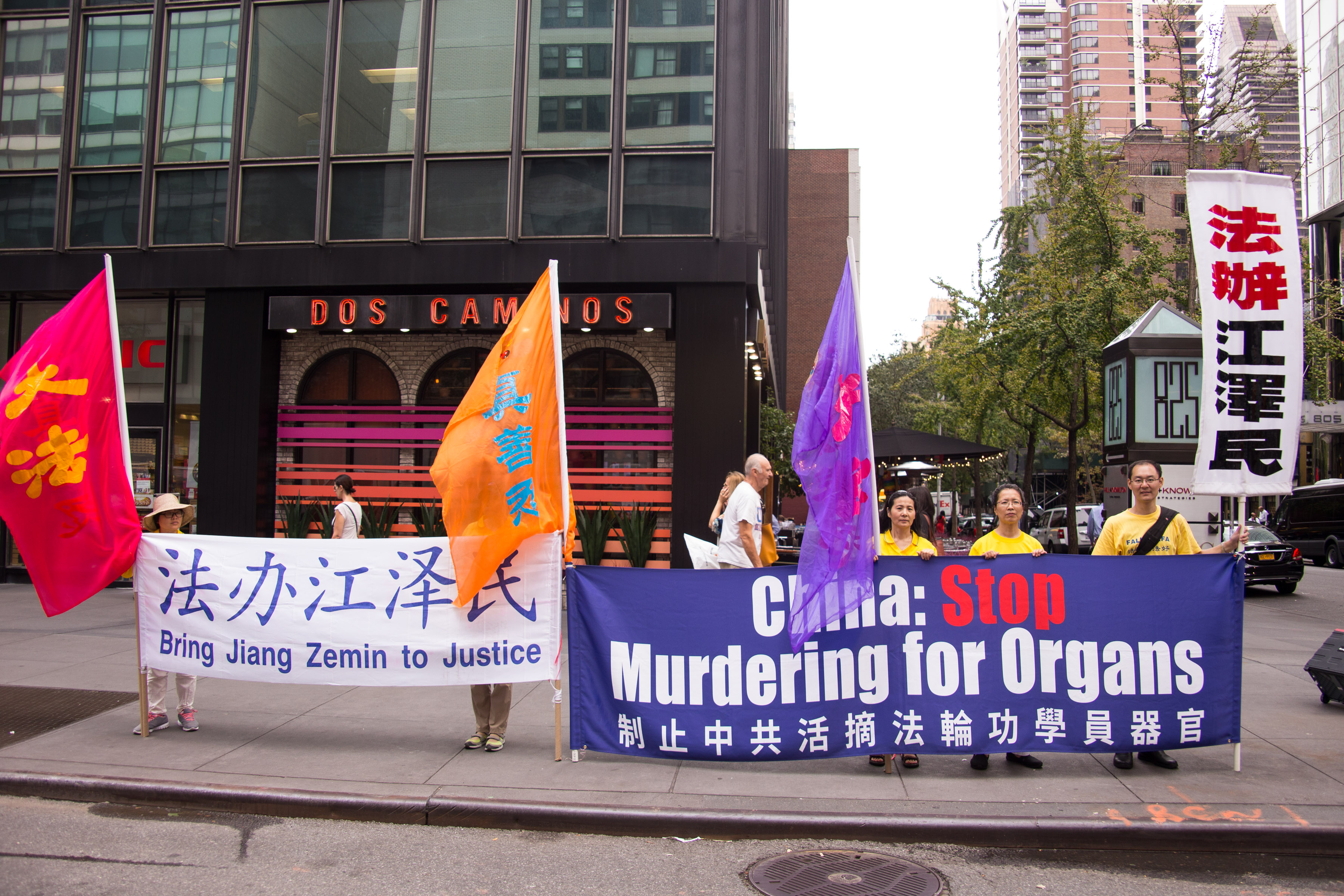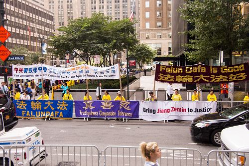图1-2:联合国大厦对面,法轮功学员呼吁停止迫害,法办江泽民