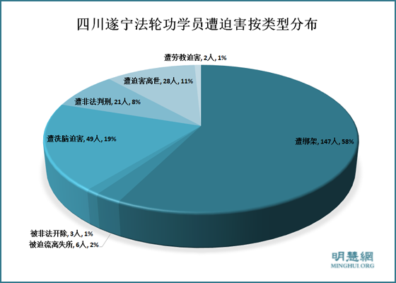 2011年1月至2016年8月,遂宁有171名法轮功学员遭受迫害,28人被迫害离世,21人被非法判刑,2人被非法劳教,147人被绑架,49人被洗脑迫害……
