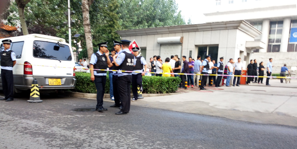 法院四周拉起警戒线,到处是身着防弹衣的特警与便衣,有几个便衣手拿录像设备给周围的百姓录像。几辆警车和特警的车布置在法院正门的两侧。