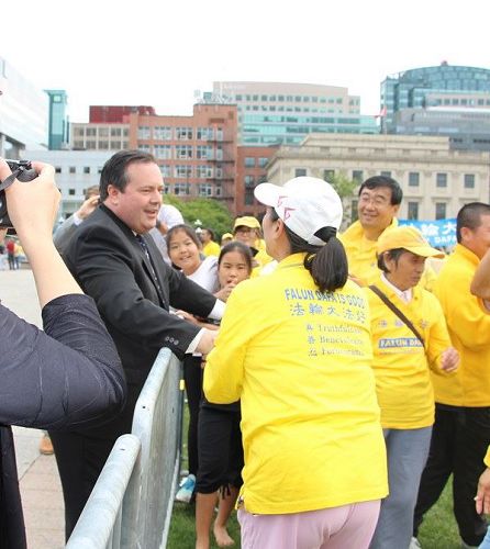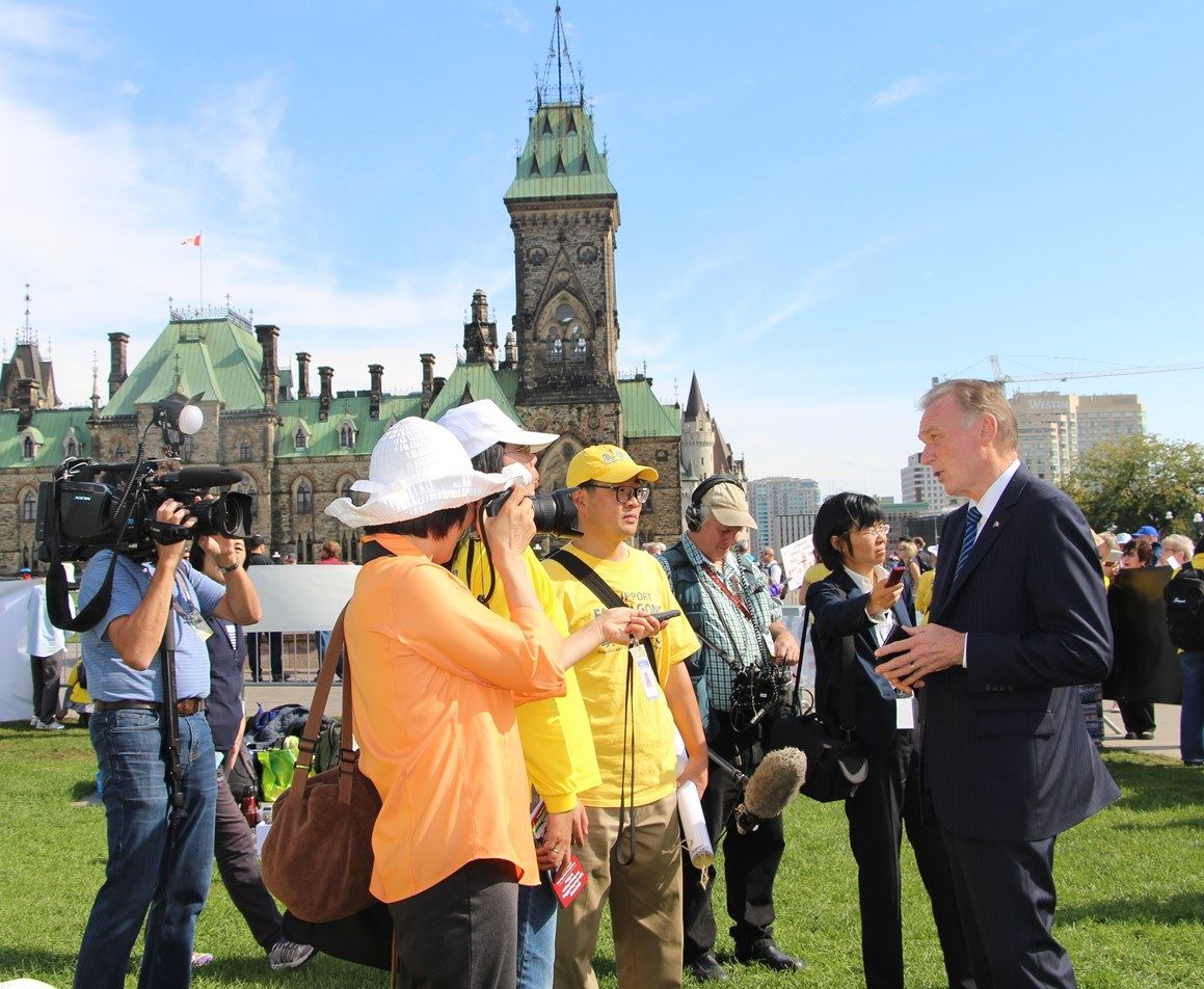 曾经担任联邦移民部长、国防部长以及就业发展部长的资深联邦保守党国会议员康尼(Jason Kenney)来到现场。当天是康尼作为二十年国会议员的最后一天,他特意赶到法轮功学员的集会现场表达他对法轮功学员的心意。