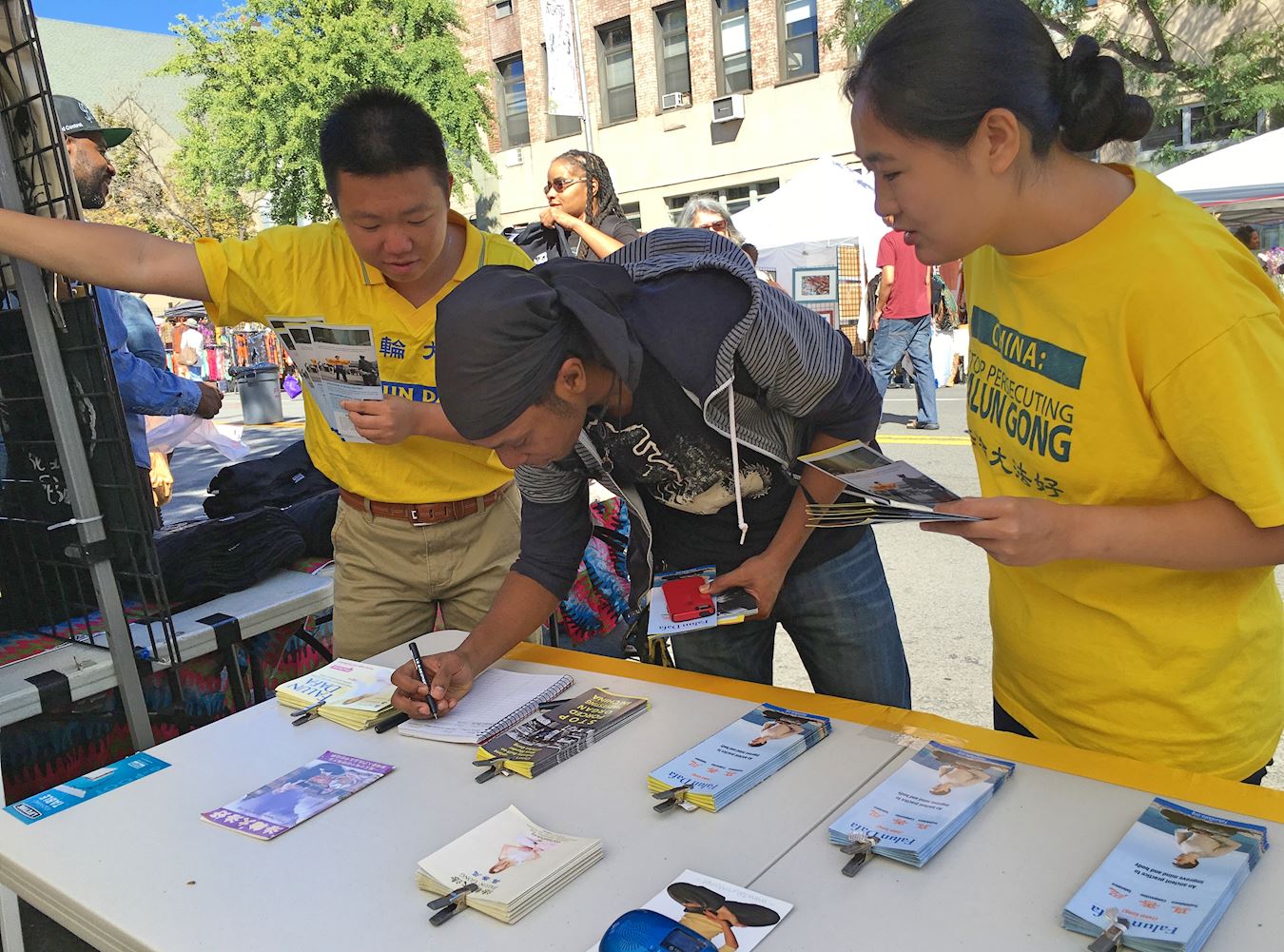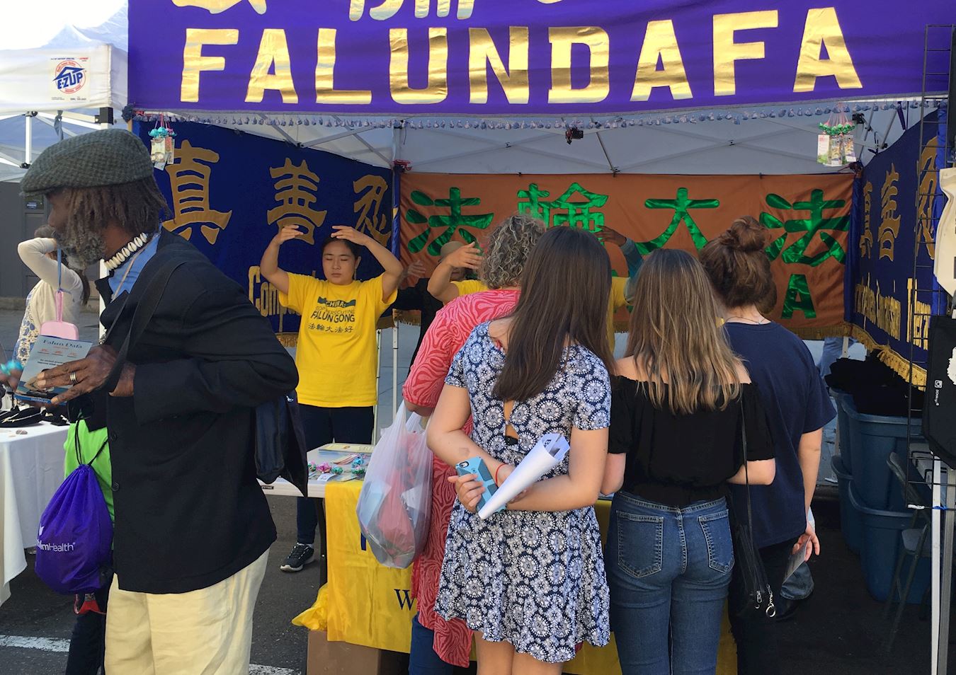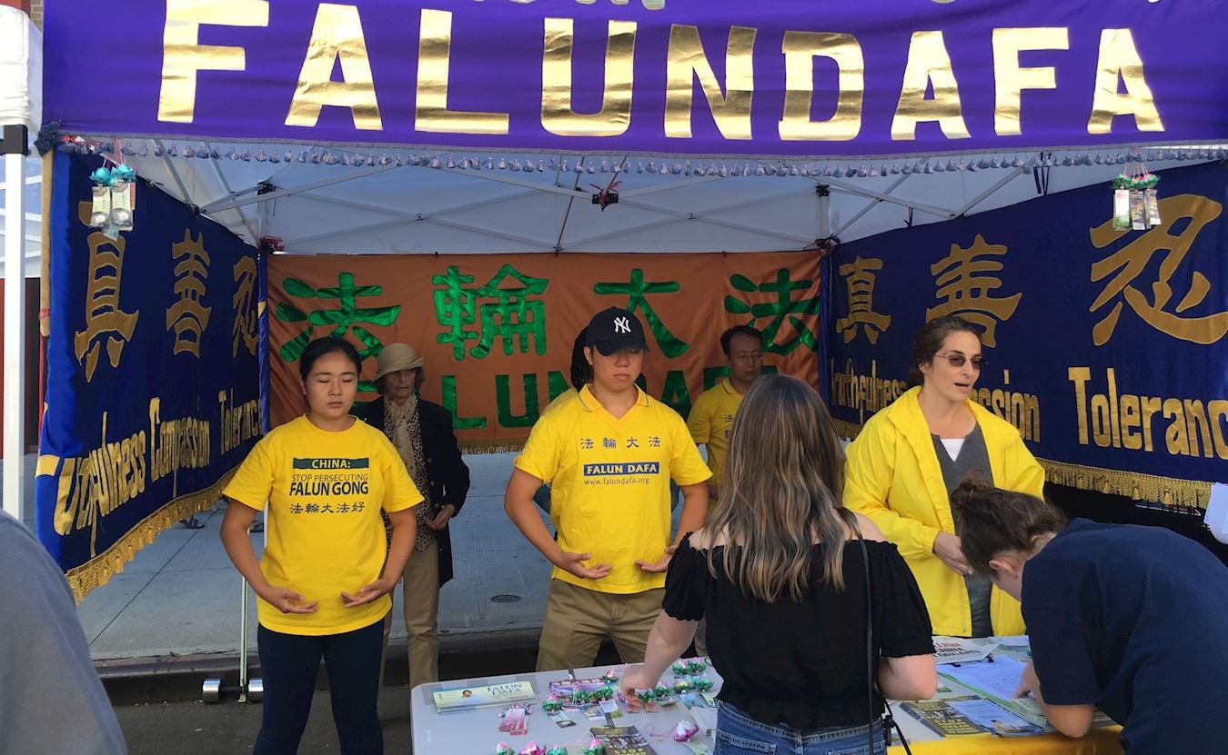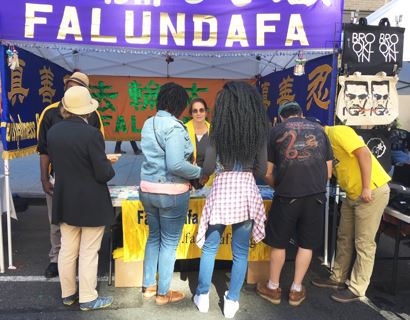 热闹的集市上,法轮功的展位显得格外清新脱俗,中、西方法轮功学员穿着耀眼的、印有“法轮大法”字样的黄色T恤衫演示法轮功的五套功法,学员们舒缓的动作、祥和的神态于嘈杂的人群形成了鲜明的对比,吸引了很多纽约客好奇的目光。人们了解到法轮功能够使人身体健康、心灵平和,许多人报名参加免费的功法学习班,并有很多民众拿到介绍法轮大法的真相传单后,边走边认真阅读。