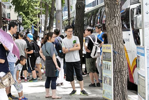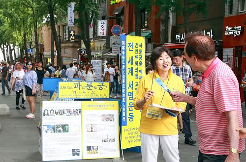 经常在韩国购物繁华地带的东大门讲真相的是一群年轻法轮功学员,他们中有正在读大学的、读研究生的,还有的正在读博士学位。正在韩国读大学的何雅(化名)讲述了自己讲真相时的各种趣闻。