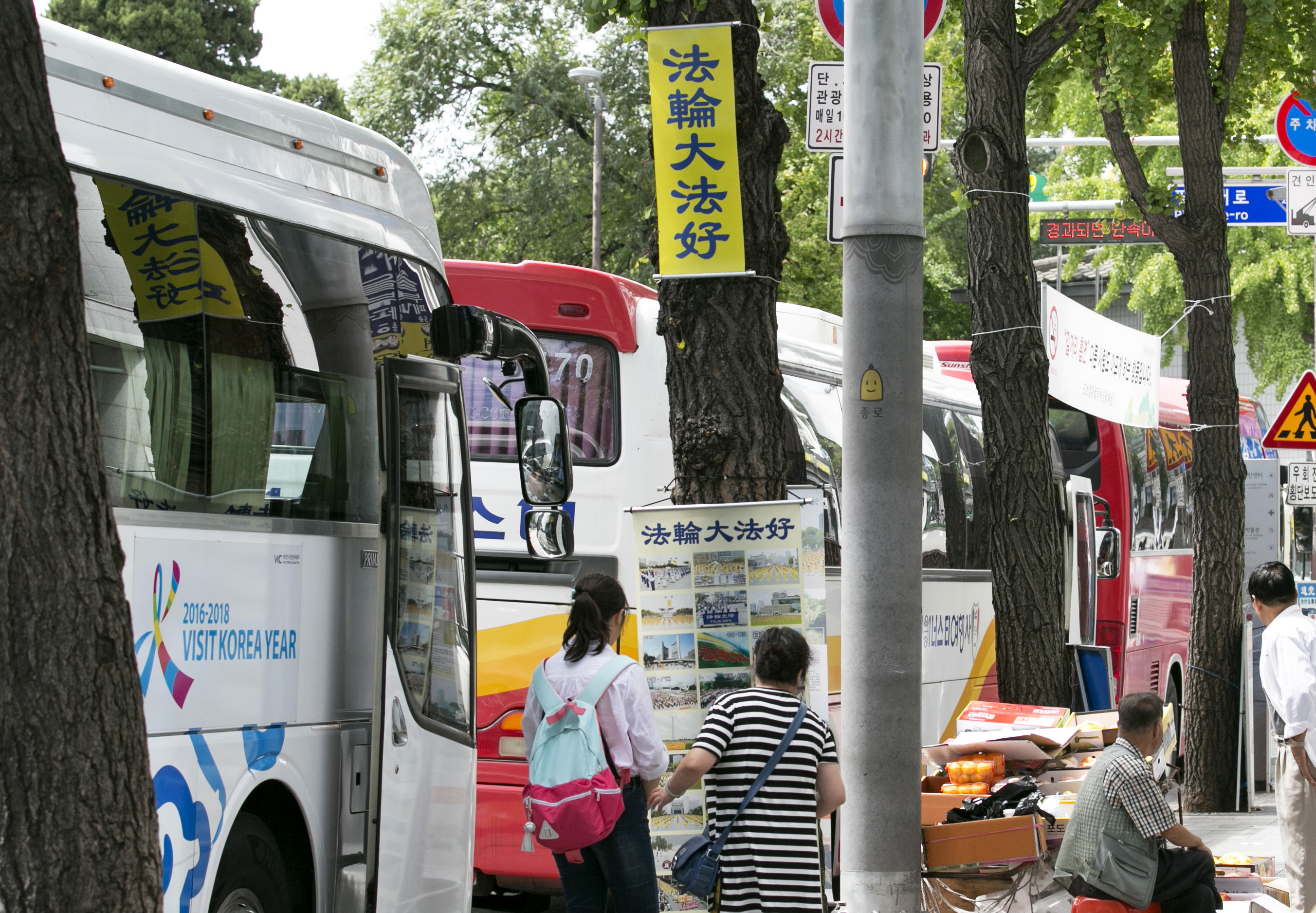 ![]() 图1-3:首尔社稷公园中的中国大陆游客观看法轮功真相展板 |