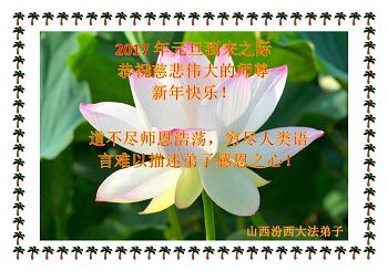 在此也祝愿明慧所有同修新年快乐!并祝愿所有同修在新的一年里,正念更强,共同精進,救度更多众生,一起和师父回家! 合十!