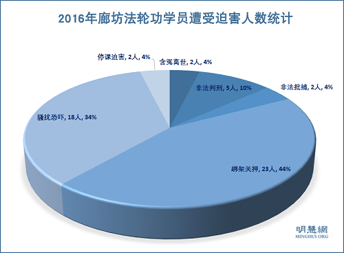 2016年廊坊市23人被绑架、非法关押;5人被非法判刑, 2人被非法批捕;有18人被骚扰、恐吓;2名教师被停课;2人因受中共长期迫害而导致含冤离世。