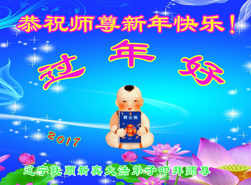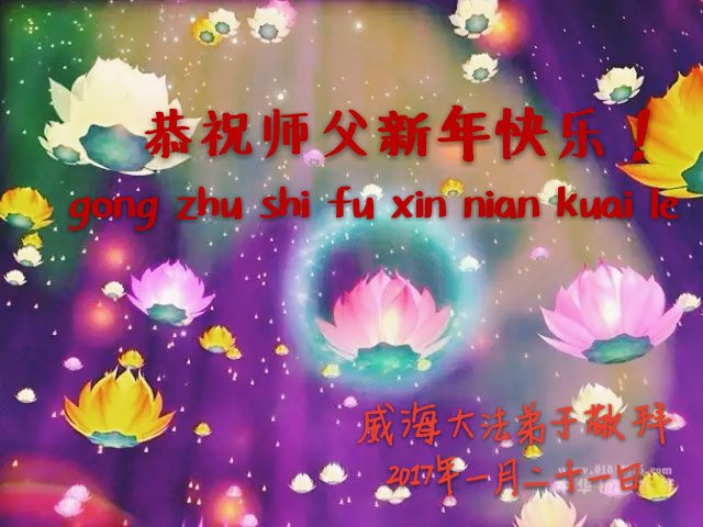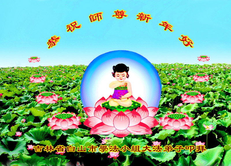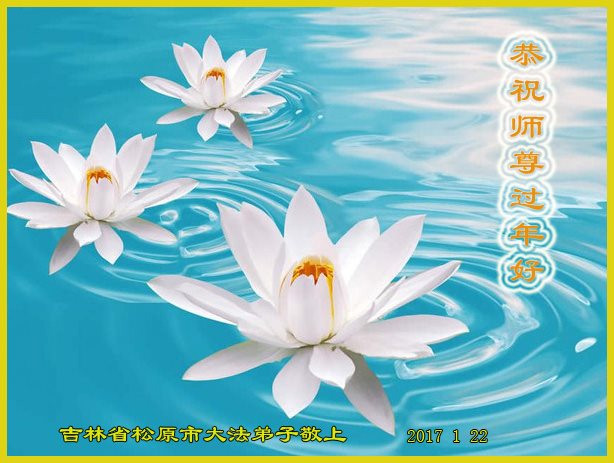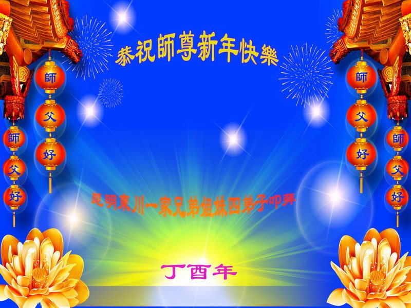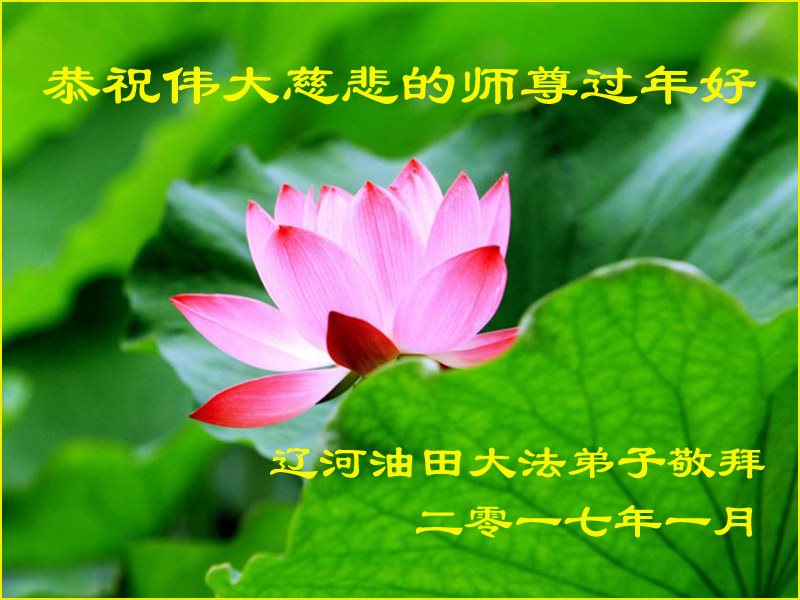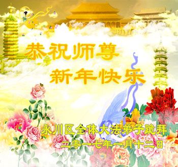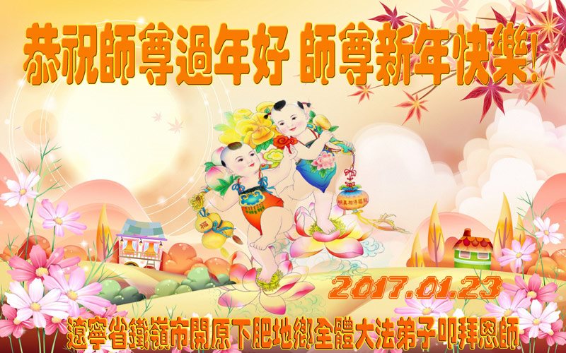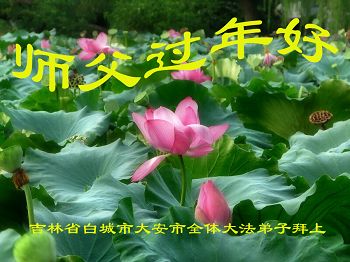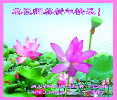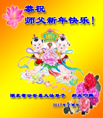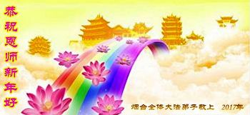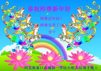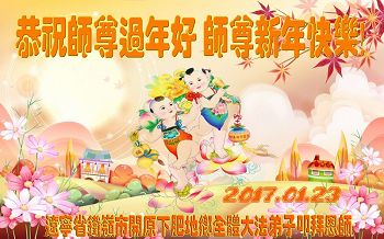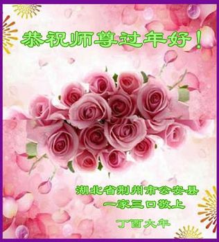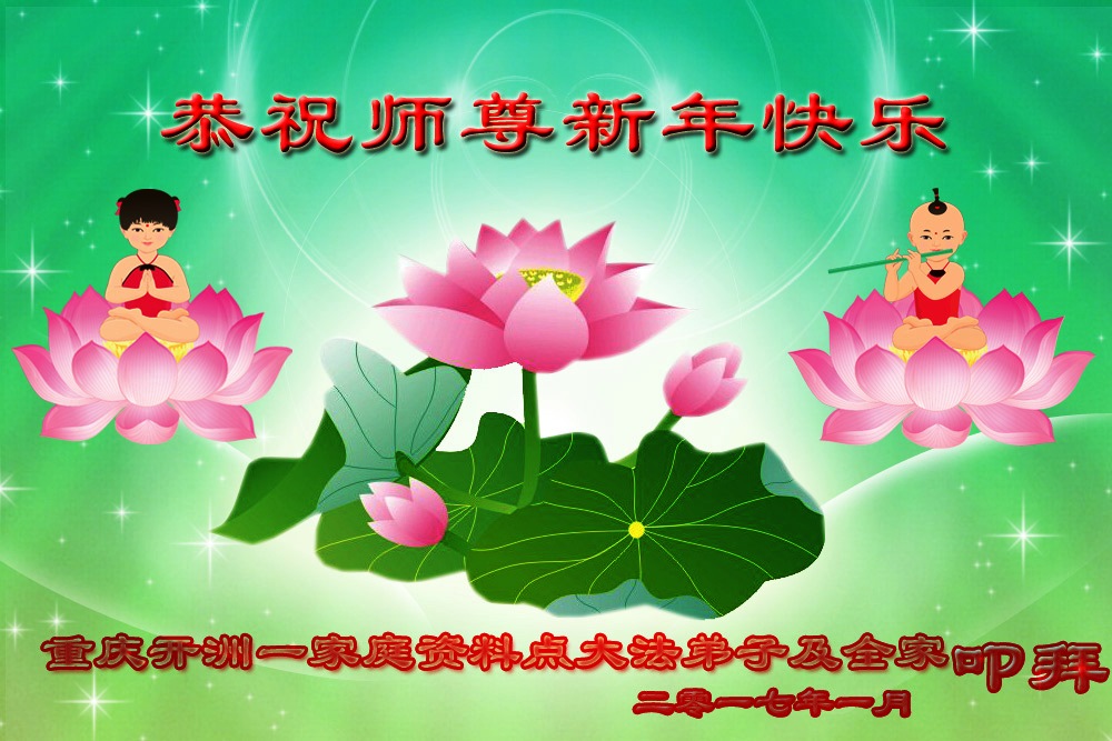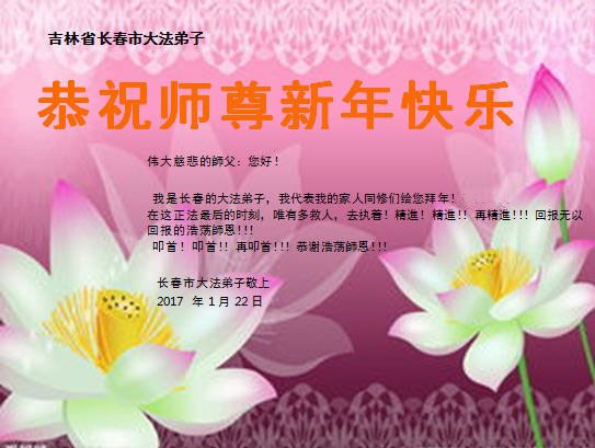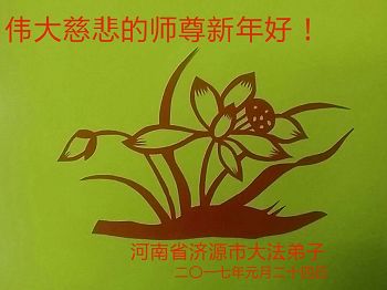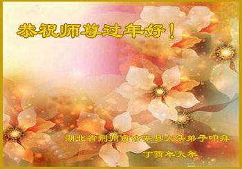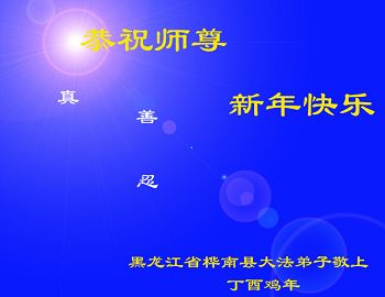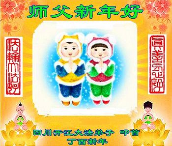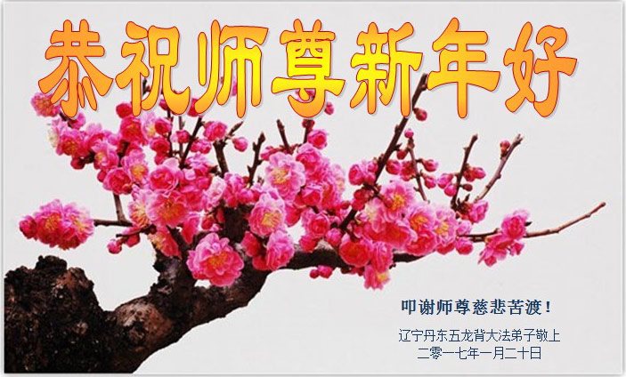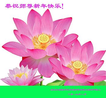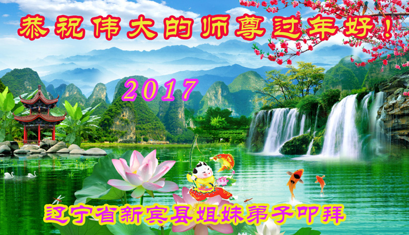 值此丁酉年新年之际,来自四川遂宁、辽宁抚顺、吉林长春、山东省威海、河北石家庄、吉林德惠、四川成都、山东招远、辽宁鞍山、湖北武汉、吉林舒兰、辽宁义县、重庆开州、湖北天门、胜利油田等七省十五地的资料点的大法弟子给慈悲伟大的李洪志师尊拜年!