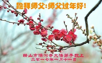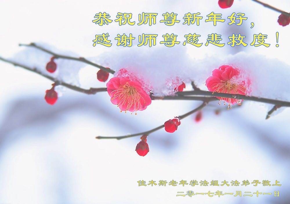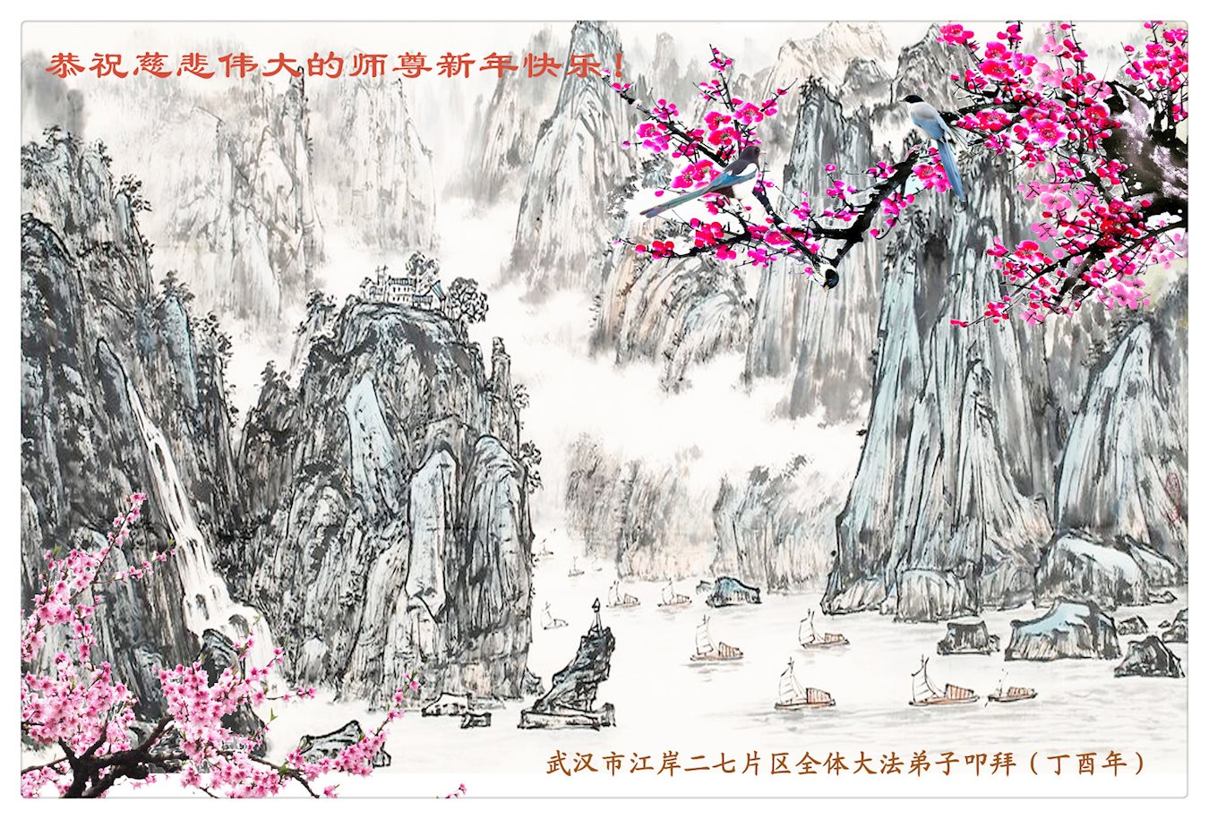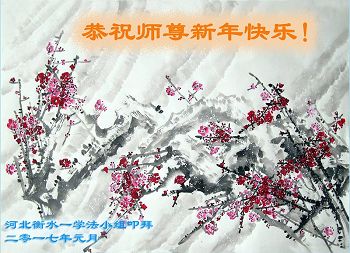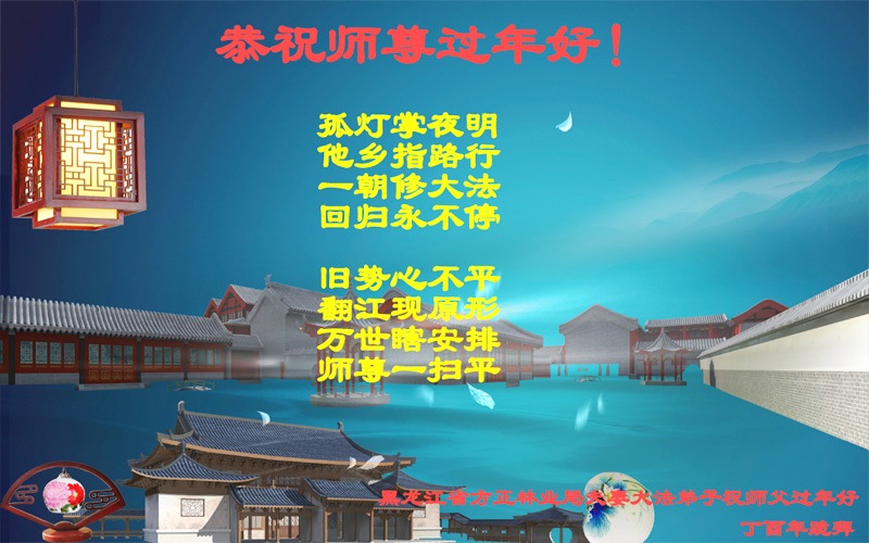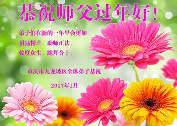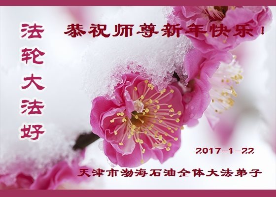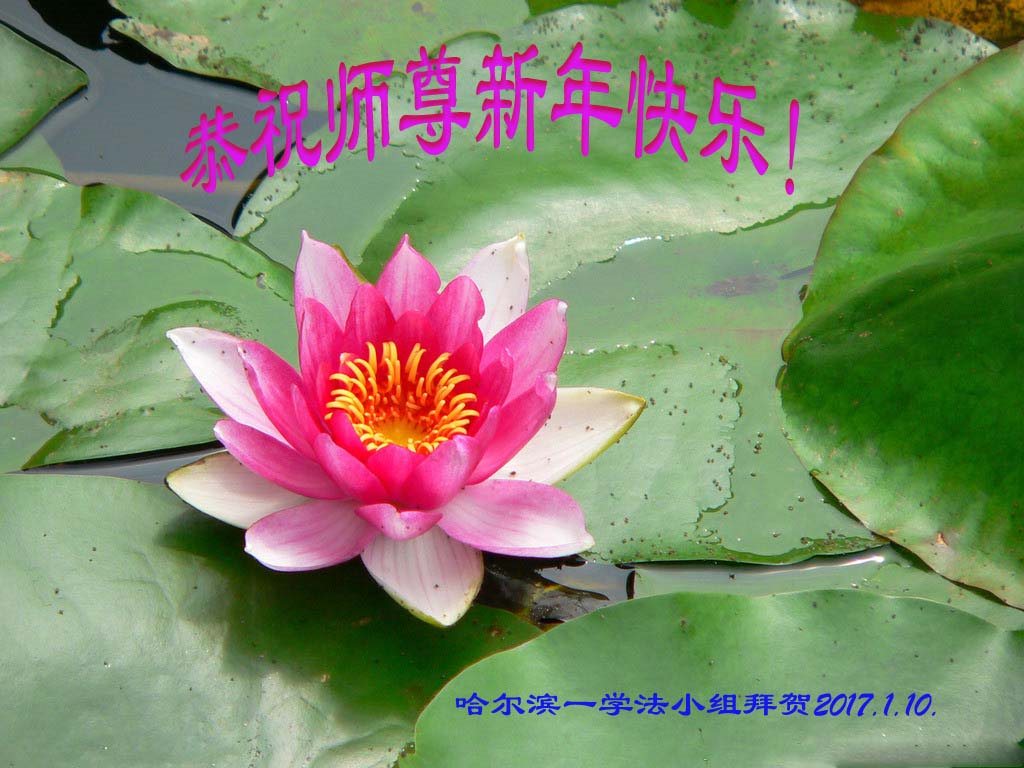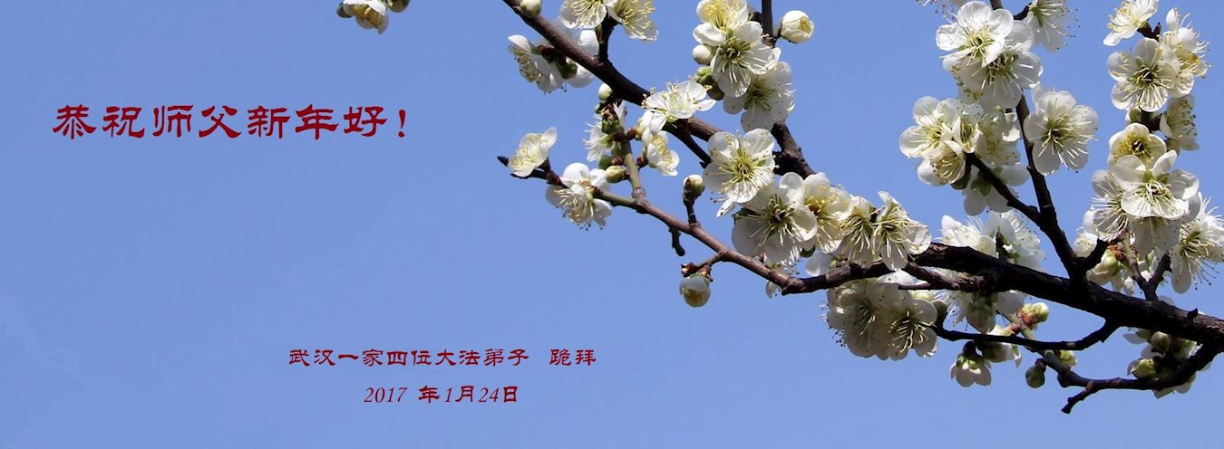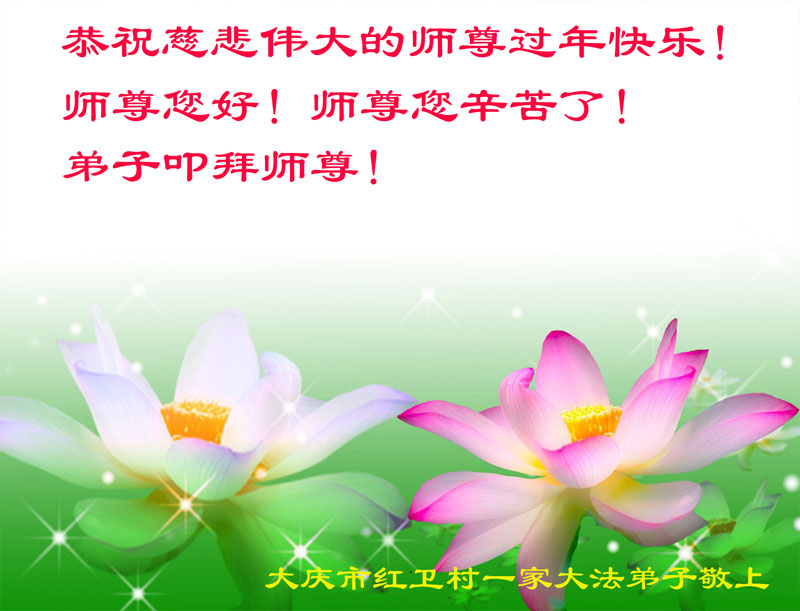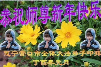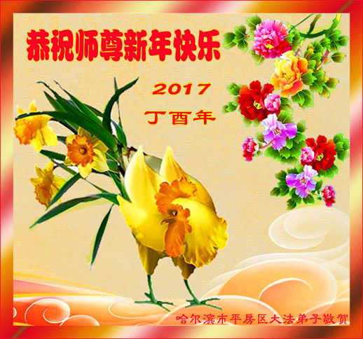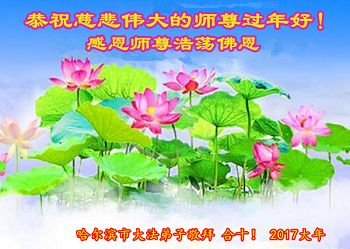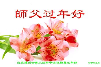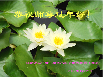 值此丁酉年新年之际,来自四川遂宁、辽宁抚顺、吉林长春、山东省威海、河北石家庄、吉林德惠、四川成都、山东招远、辽宁鞍山、湖北武汉、吉林舒兰、辽宁义县、重庆开州、湖北天门、胜利油田等七省十五地的资料点的大法弟子给慈悲伟大的李洪志师尊拜年!