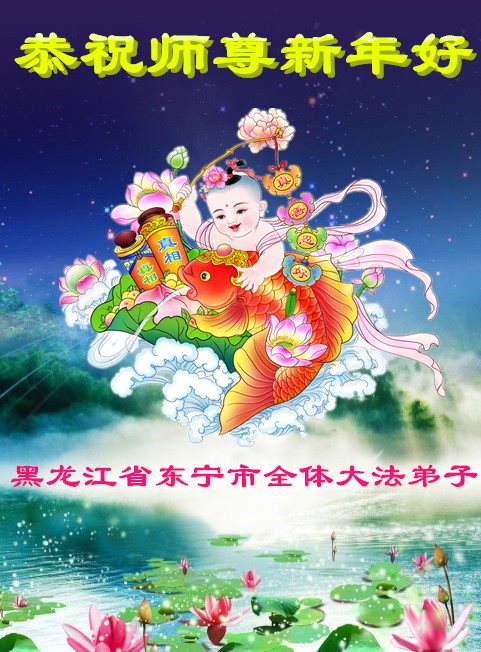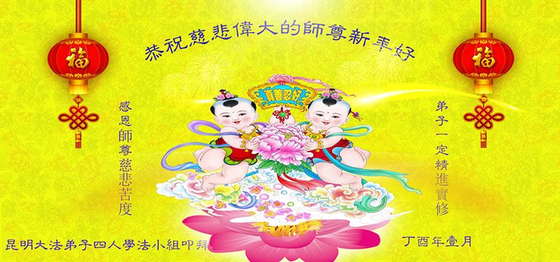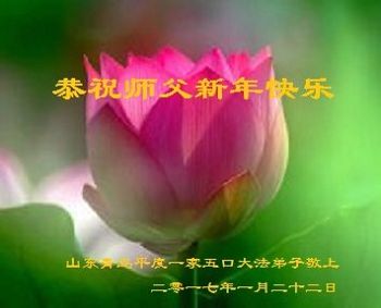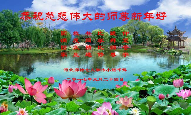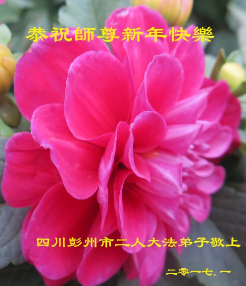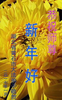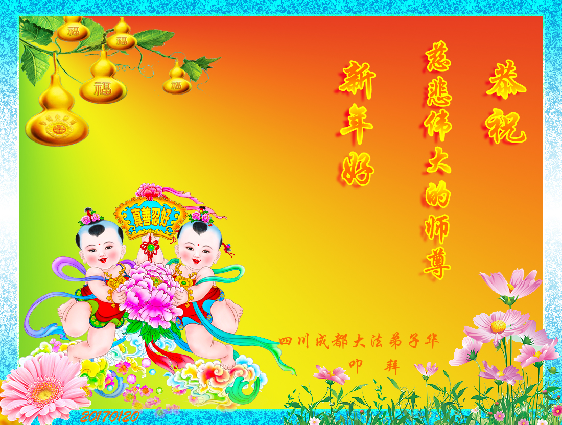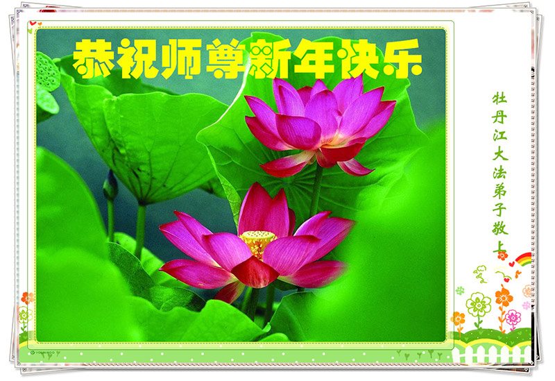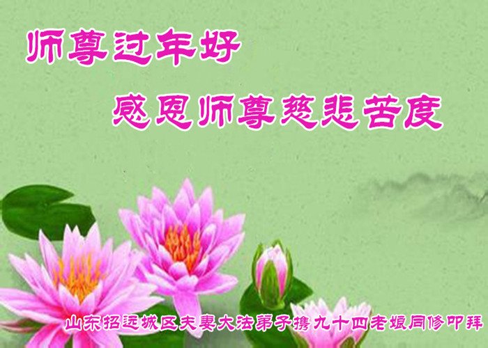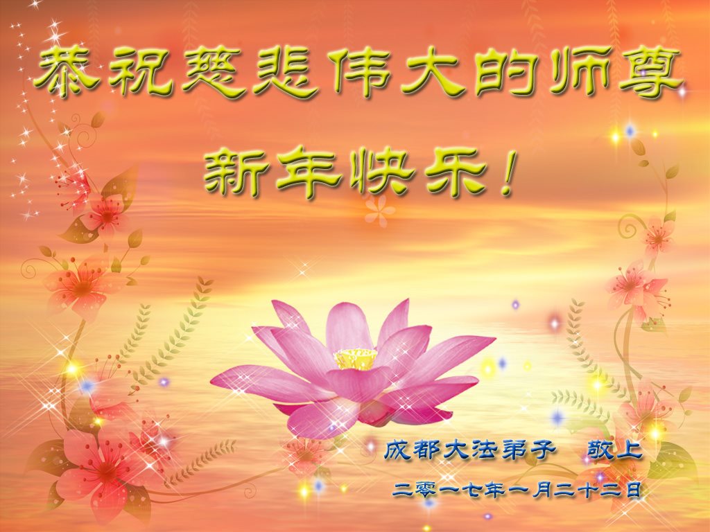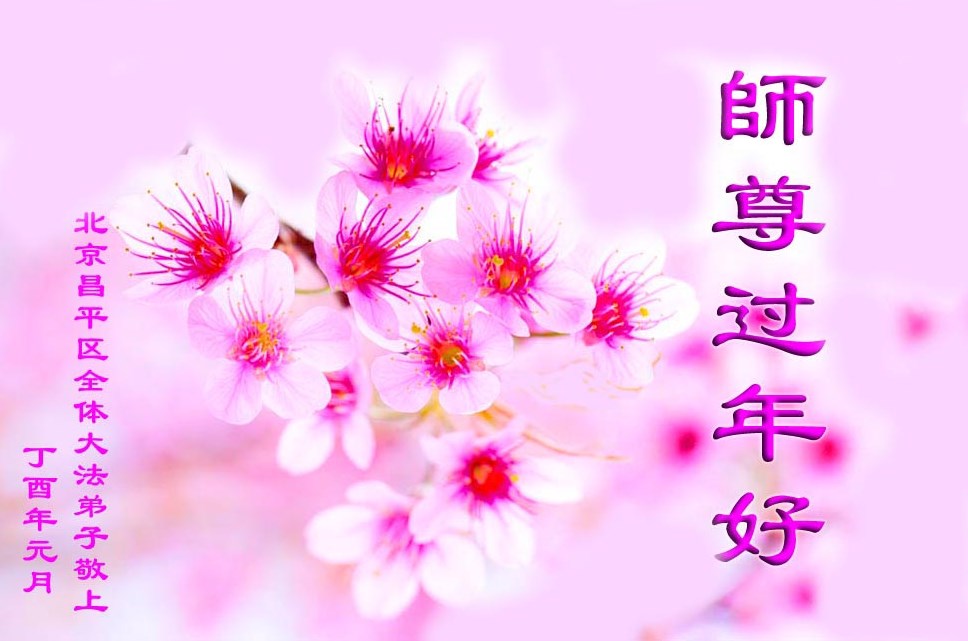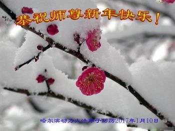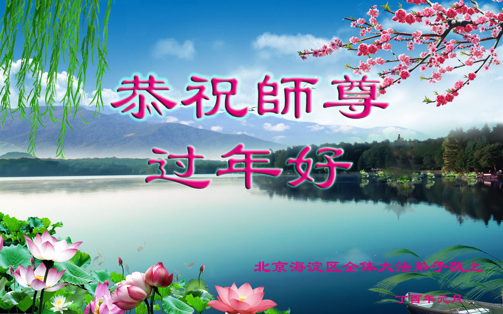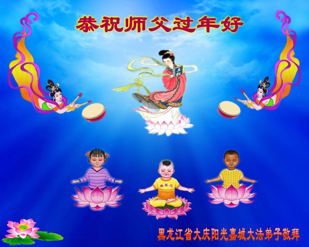 值此丁酉年新年之际,来自四川遂宁、辽宁抚顺、吉林长春、山东省威海、河北石家庄、吉林德惠、四川成都、山东招远、辽宁鞍山、湖北武汉、吉林舒兰、辽宁义县、重庆开州、湖北天门、胜利油田等七省十五地的资料点的大法弟子给慈悲伟大的李洪志师尊拜年!