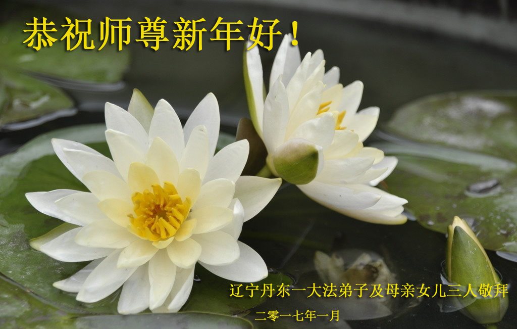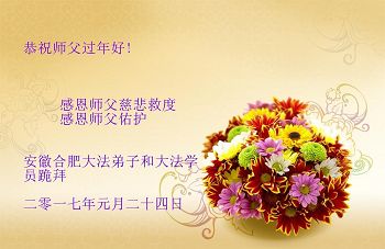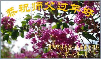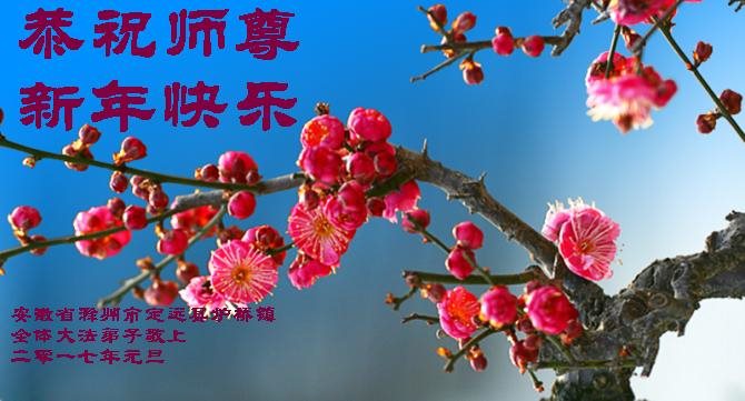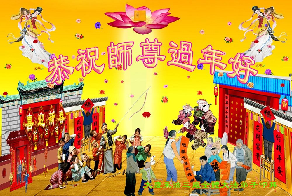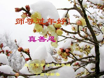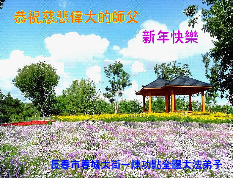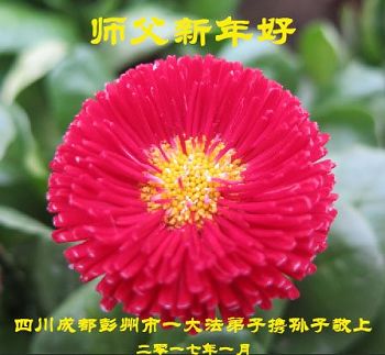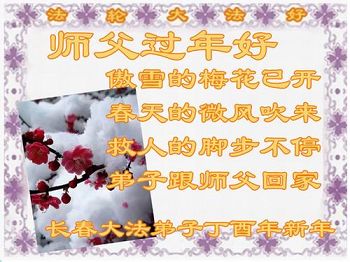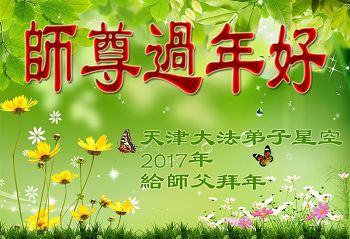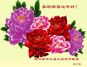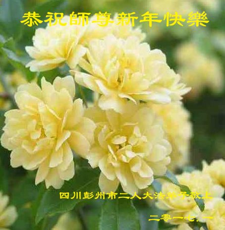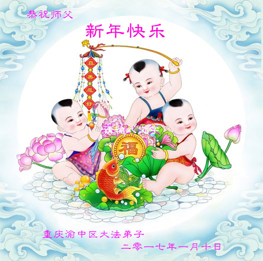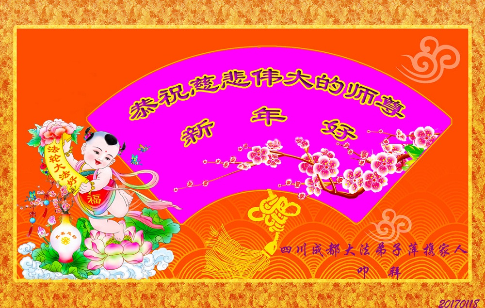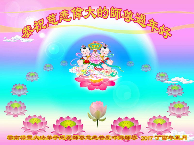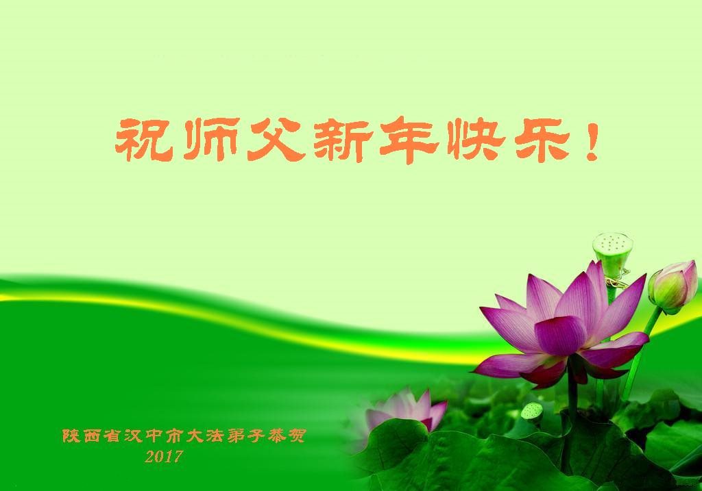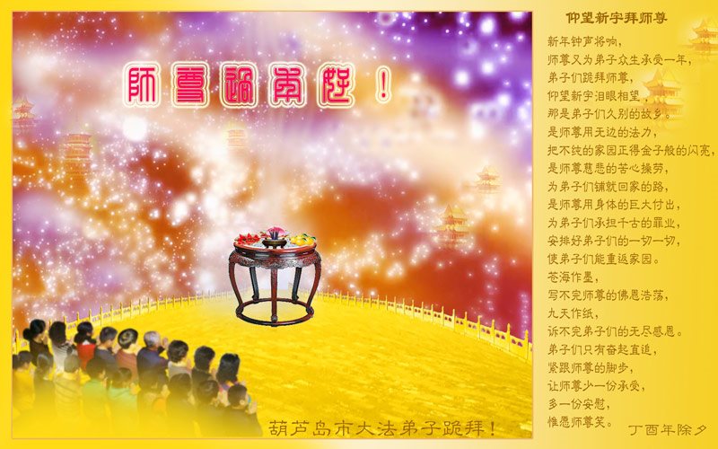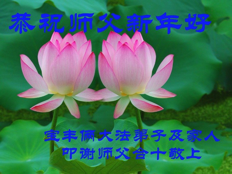 值此丁酉年新年之际,来自四川遂宁、辽宁抚顺、吉林长春、山东省威海、河北石家庄、吉林德惠、四川成都、山东招远、辽宁鞍山、湖北武汉、吉林舒兰、辽宁义县、重庆开州、湖北天门、胜利油田等七省十五地的资料点的大法弟子给慈悲伟大的李洪志师尊拜年!