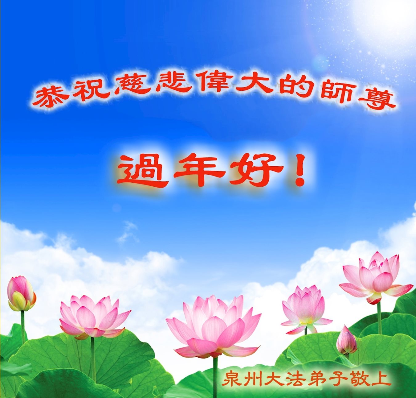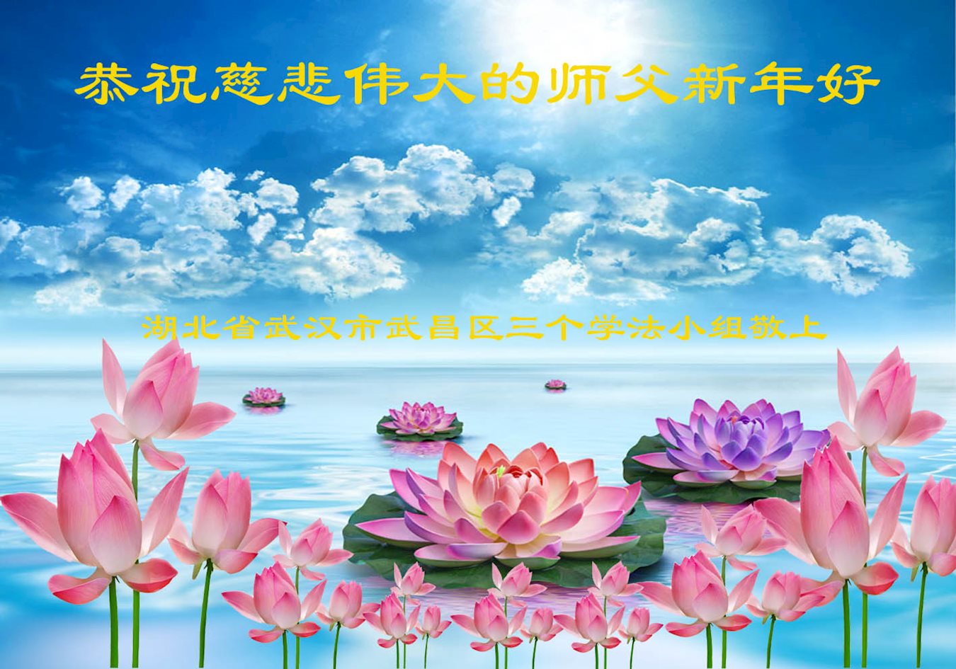 在这佛光普照,万象更新、阳光灿烂、圣洁美好的时光里,我们迎来了新的一年。举目欢歌庆新年,弟子虔诚祝贺,恭祝师尊新年快乐!师尊您好,师尊辛苦了。