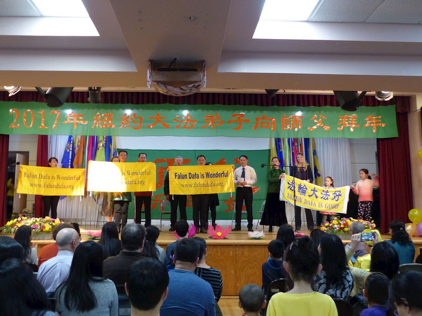 每到新年,纽约法轮功学员都举办活动给师父拜年。当天,在法拉盛的台湾会馆大厅内外挤满了人,有白发苍苍的长者,也有三、四岁稚气未脱的孩童,也有妈妈带着襁褓中的婴儿,白裔、非裔、印度裔等,不同族裔的法轮功学员,从四面八方齐聚一堂。