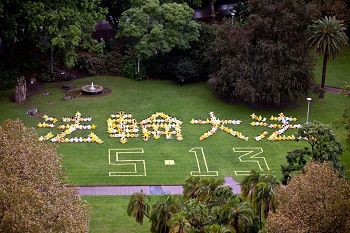 ![]() 图:法轮功学员合唱《法轮大法好》后高举福字帖,向市民祝福。 |