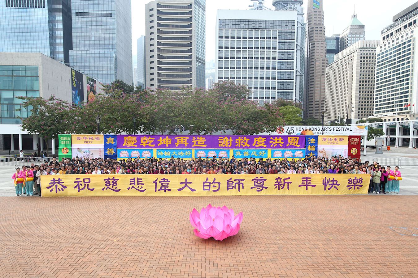【明慧网二零一七年一月三十日】二零一七年一月二十八日,丁酉新年大年初一早上,在微寒的天气下,香港大会堂外的爱丁堡广场春意盎然、喜气洋洋。数百名法轮功学员欢聚一起,以最诚挚的心情,恭祝法轮功创始人李洪志师父新年快乐,敬谢浩荡师恩。